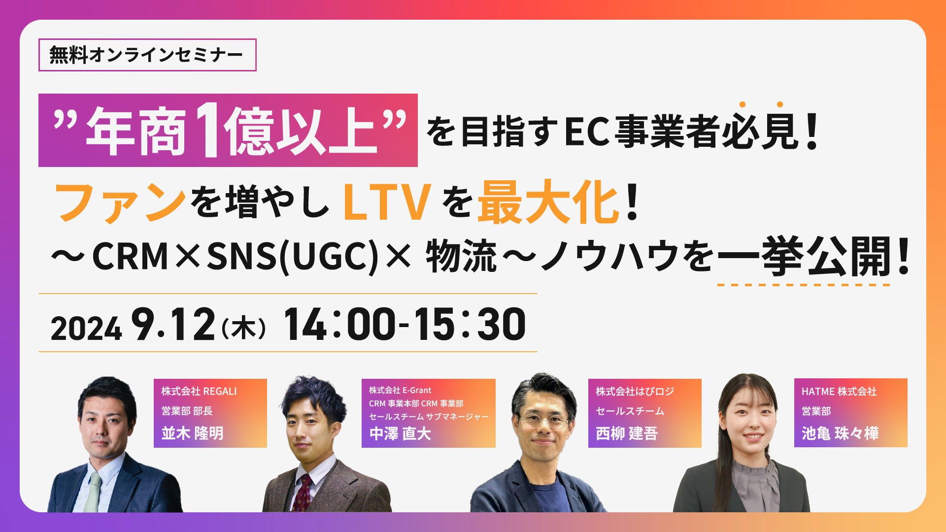 マーケティングアソシエーション株式会社の子会社であるHATME株式会社(本社:東京都台東区 代表取締役:中園広和、以下当社)は2024年9月12日(木)に、ウェブセミナー「”年商1億以上”を目指すEC事業者必見! ファンを増やしLTVを最大化!~CRM×SNS(UGC)×物流~ノウハウを一挙公開!」を、株式会社E-Grant、株式会社REGALI、株式会社はぴロジと共催いたします。