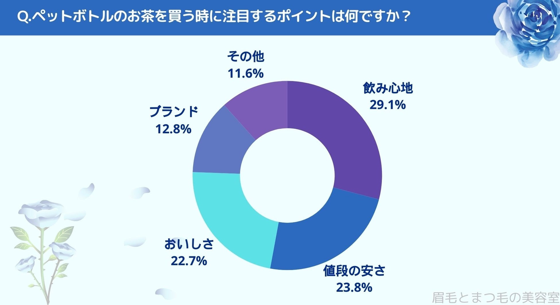 ペットボトルのお茶を買うときに注目するポイントをお聞きしたところ「飲み心地(29.1%)」、「値段の安さ(23.8%)」、「おいしさ(22.7%)」、「ブランド(12.8%)」、「その他(11.6%)」という結果になりました。