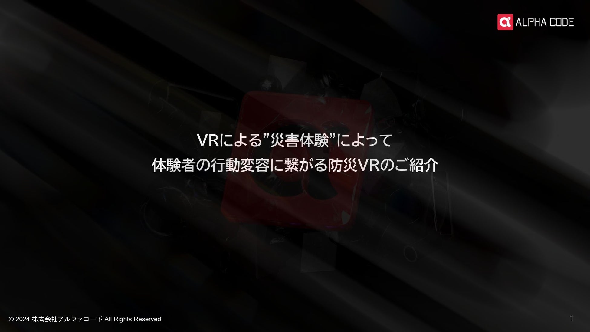 弊社アルファコードでは、コンテンツを制作する際に体験者に”経験”をさせることに主眼を置いており、体験者の想像を超える良質な”経験”を提供することで、体験者の認識を変え行動に変化を与えるコンテンツ制作を可能にしております。本セミナーでは、『そもそもVRとはなにか』『防災・災害対応でどのようにVRが活用できるのか』を2023年に弊社が東京都と共同制作した防災VRを通してご紹介致します。