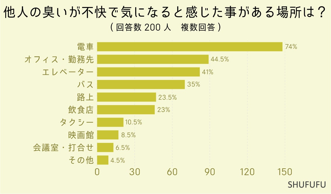 他人の臭いが不快で気になると感じた事がある場所は?(複数回答)の問いに対して最も多かったのが「電車(74%)」でした。 次いで「オフィス・勤務先(44.5%)」「エレベーター(41%)」という結果でした。電車では不特定多数の人と隣に座ったり、立っている時に密着するシーンもあるのでそれだけ不快な臭いを感じる機会も多くなりそうですね。