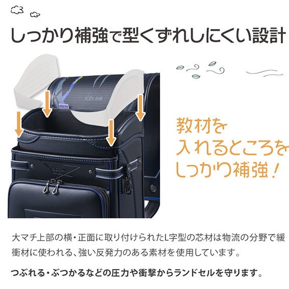 教材を入れる大きなマチの上部には、「パワフルガード」と呼ばれるL字型の芯材が入っています。その素材は物流業界で緩衝材として使用される丈夫なもので、潰れたりぶつかったりする衝撃からランドセルを守ってくれます。