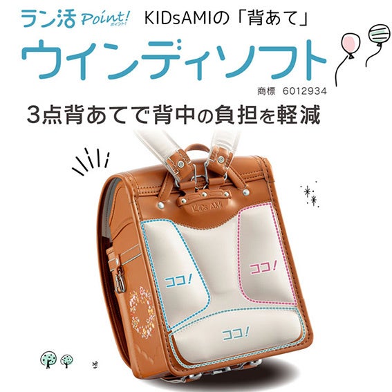 「キッズアミランドセル」の「背あて」部分には、「ウィンディソフト」と呼ばれるクッションが使用されています。これは、人間工学に基づいて同社が独自で開発した構造で、3つの背あて部分が重みを分散し、背中に圧力がかからず安定して背負えるようになっています。背中と背あてとの間に隙間ができることで通気性もよく、夏の暑い時期の登下校も安心です。