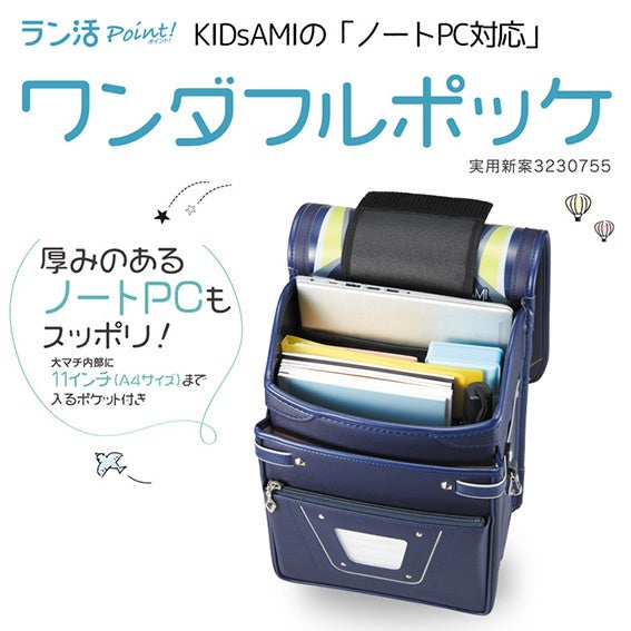 デジタル教科書が導入され、一人一台端末を持つ学校も増えています。高価な機材でも安全に持ち運べるよう、ランドセルの内部に「ワンダフルポッケ」という専用ポケットが付いたタイプも用意されています。11インチ(A4サイズ)のPCまで収納することができます。