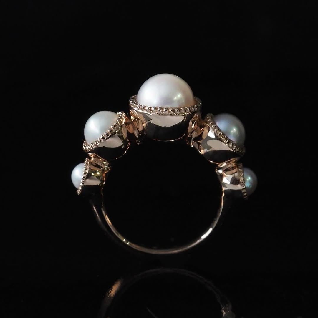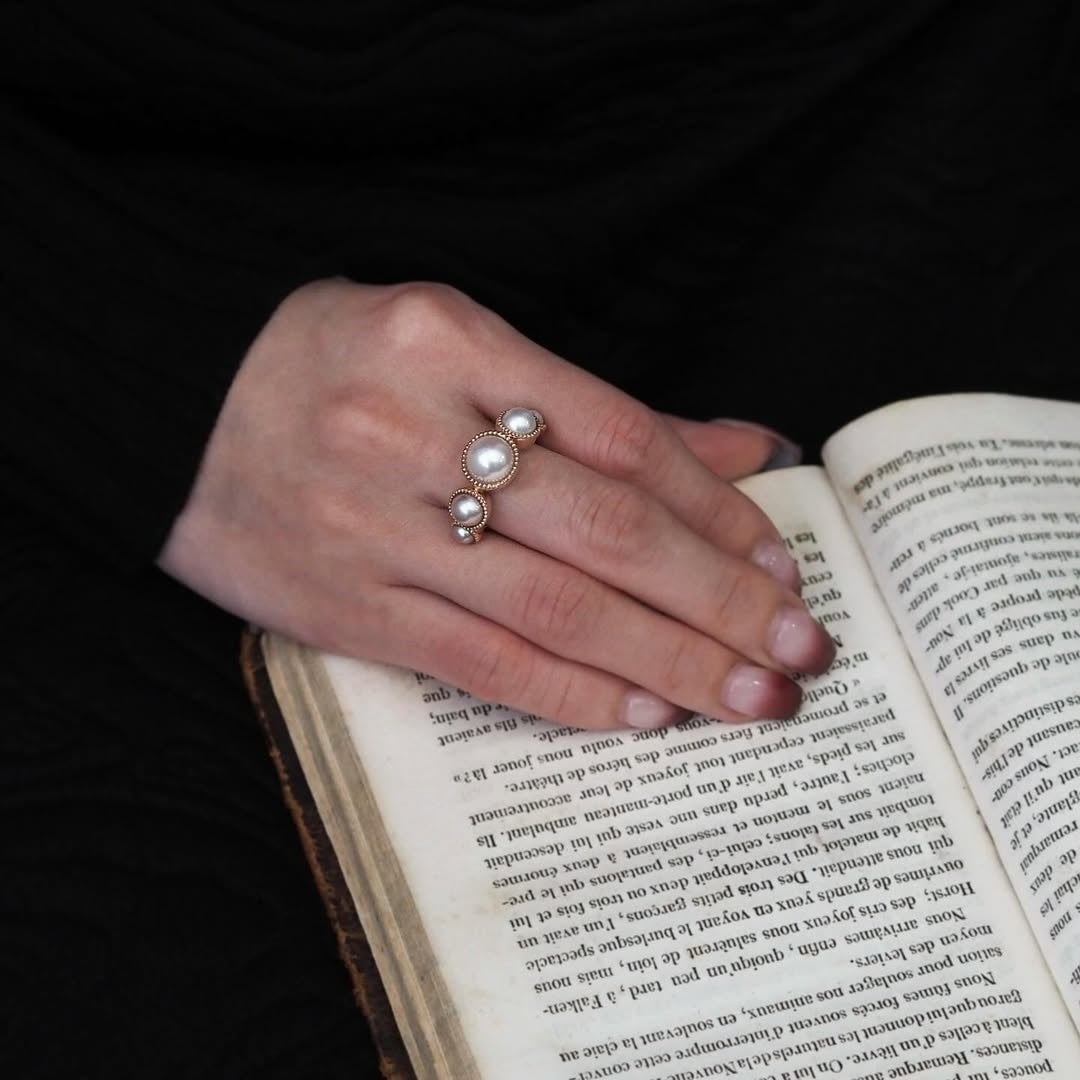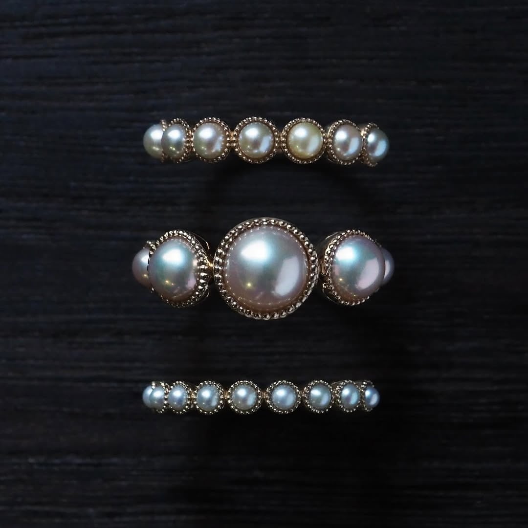 今回登場するリングには、4mm・6mm・8mmの湖水真珠を贅沢に5珠使用。まろやかなホワイトに、ピンクやオレンジ、グレーの干渉色が重なり合い、珠ごとに異なる色合いを繊細に組み合わせたグラデーションが、手元を華やかに演出します。大ぶりの真珠ならではの、眩い照りと豊かな色彩が指元を明るく彩り、まるでアンティークジュエリーのような優雅な佇まいを醸し出します。
