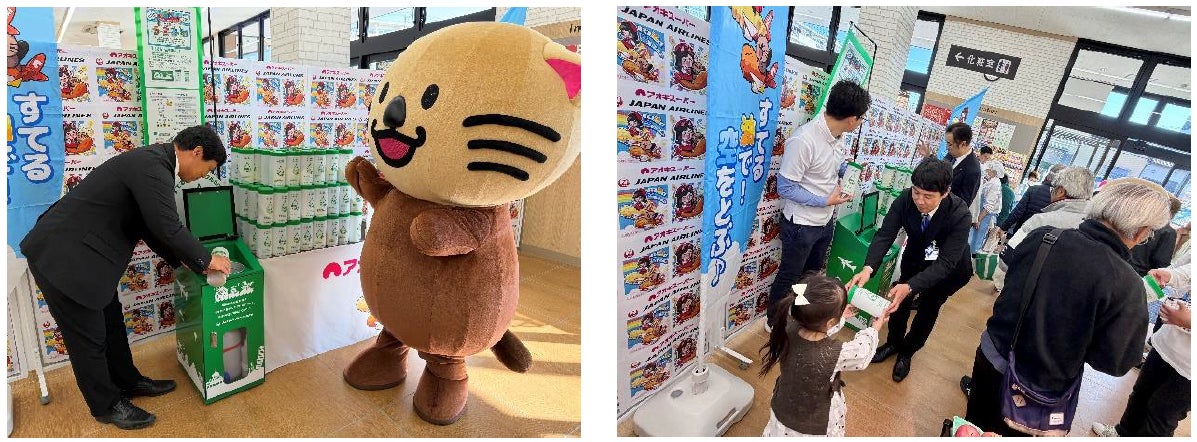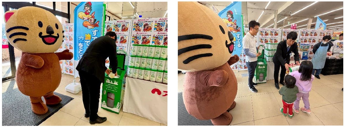 店頭での廃食油の回収開始にあたり、地域の皆様に本取り組みをより身近に感じていただくことを目的に、各店先着100名様にJALオリジナルUCO(Used Cooking Oil)ボトルをプレゼントする『スタートアップイベント』を両社共同で開催いたしました。