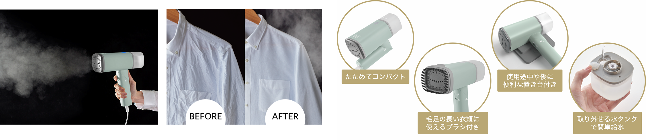 1分あたり約20gの大量スチームとパワフル噴出設計で、納得のスチーム力を実現!衣類のシワをきれいに伸ばします。電源を入れて約30秒でスチームが出るので、忙しい朝のタイミングでもハンガーにかけたままさっと手軽にシワ伸ばしができます。毛足を整えたり、汚れを掻き出しながらスチームをかけられるブラシと、便利な置き台も付属。本体は折りたたみができ、コンパクトに収納できます。