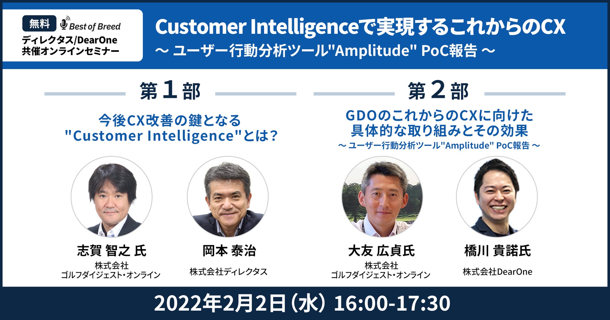 第一部では、株式会社ゴルフダイジェスト・オンラインのCMO&CIO 志賀 智之氏をお迎えし、株式会社ディレクタス 代表取締役岡本 泰治氏より、今後のデータマーケティングに欠かせない機能となる”Customer Intelligence”についてお話しを伺います。