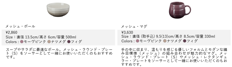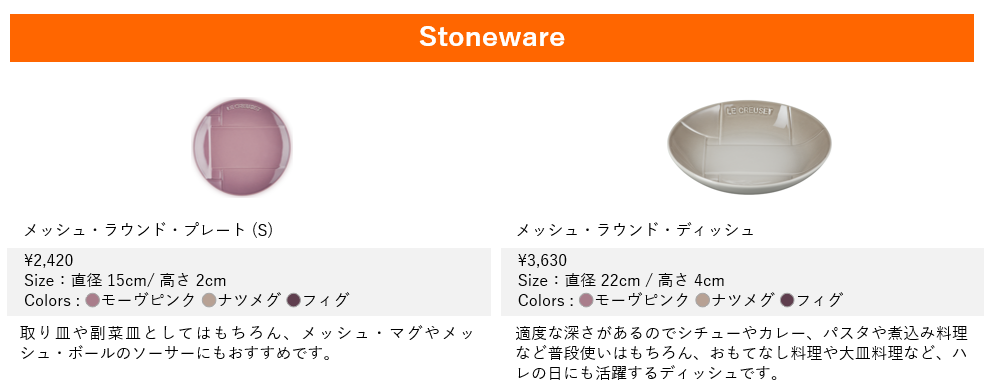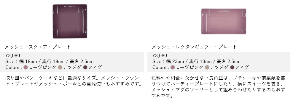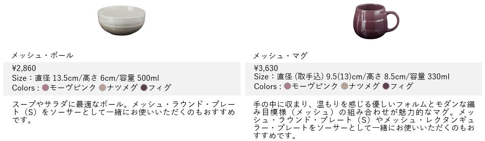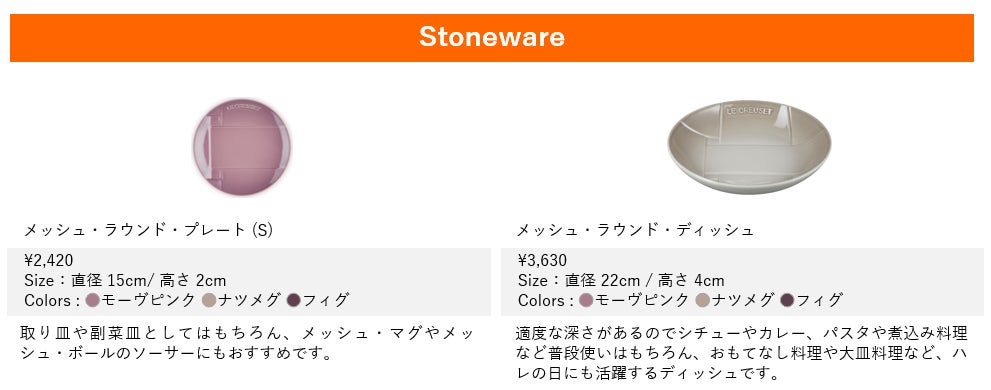 ・ストーンウェア 昨年発売し、大好評を博したストーンウェアコレクション「メッシュ」が新色を迎えて再登場。フランスと日本の文化の融合をモダンな編み目模様(メッシュ)で表現したシリーズです。大胆なメッシュの幾何学模様はスタイリッシュでありながら、和の料理とも見事にマッチするデザインです。線と形が織りなす絶妙なバランスは、お料理やシーンを選ばないデザインが魅力です。
