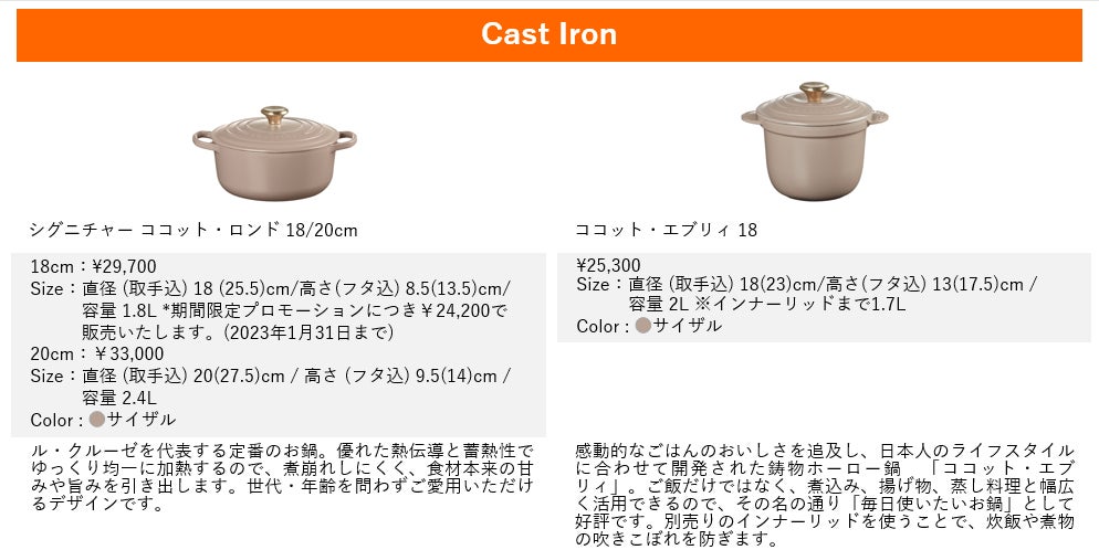 ・鋳物ホーローウェア やさしい自然の温もりに包まれたような秋の新色「サイザル」は、マットな美しいグレージュトーンが印象的。麻のようなナチュラルな風合いを感じさせる癒しのニュアンスカラー。ライトゴールドツマミをアクセントに、上品で優しく温かみのある雰囲気を演出します。