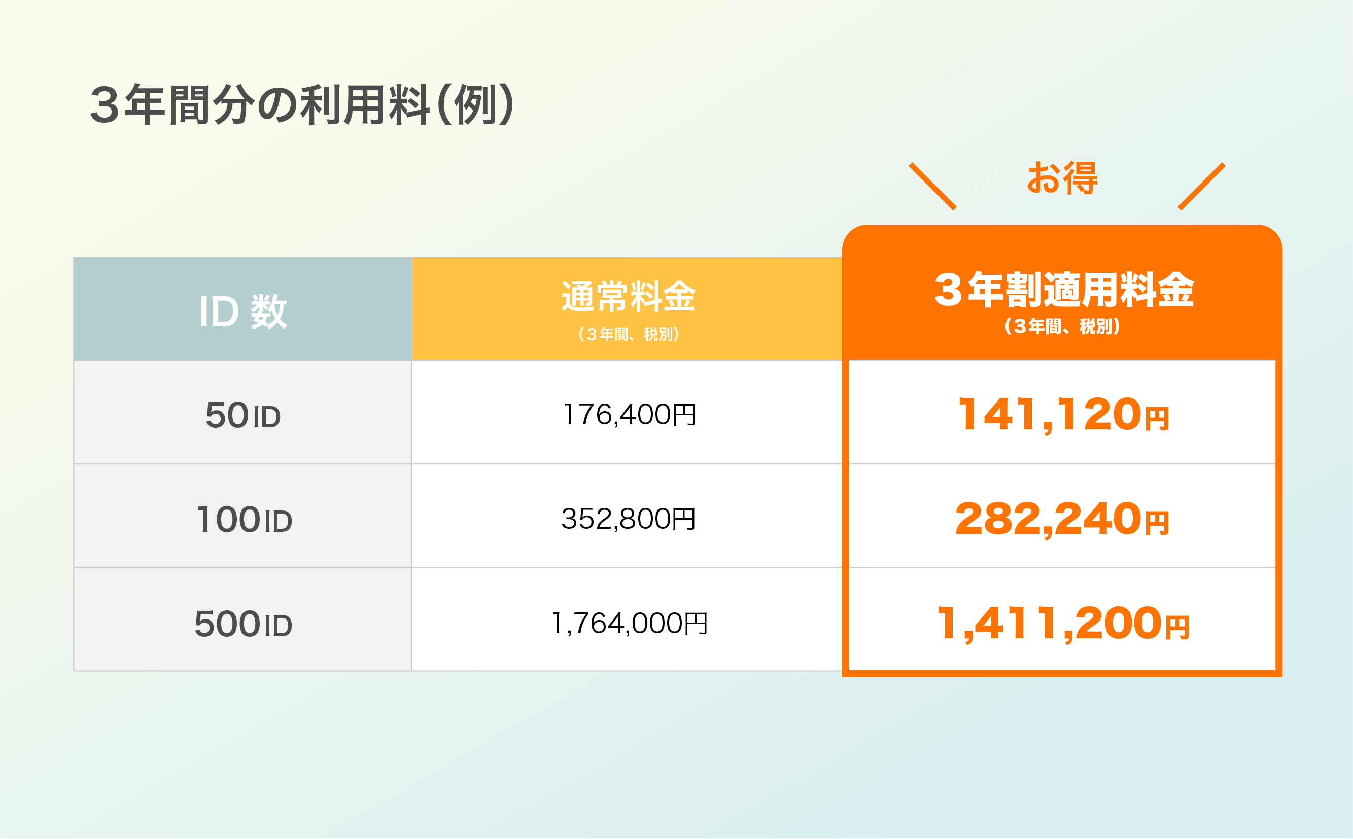 例えば、格安プランの50IDをご契約頂く場合、通常のご契約では3年間で176,400円(税別)となるところ、3年割を適用することで141,120円(税別)となり、35,280円お得になります。