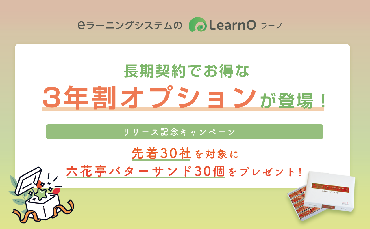 六花亭バターサンド30個を先着30社にプレゼント。eラーニングシステム「LearnO」が長期契約でお得になる「3年割オプション」のリリースキャンペーンを開催。