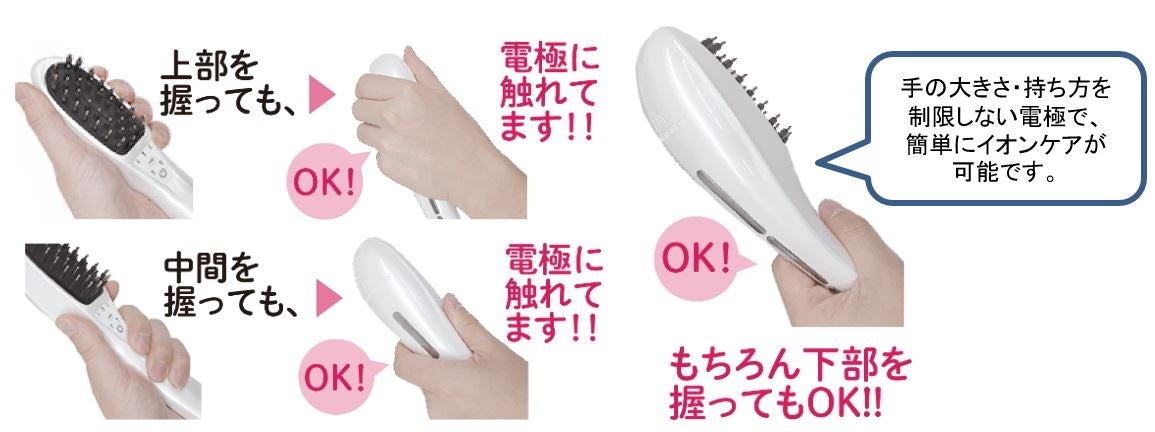 イオンケアに必要な電極は、背面に長く3分割にして配置し、どのような持ち方をしても、電極に触れるようにし使いやすくしております。
