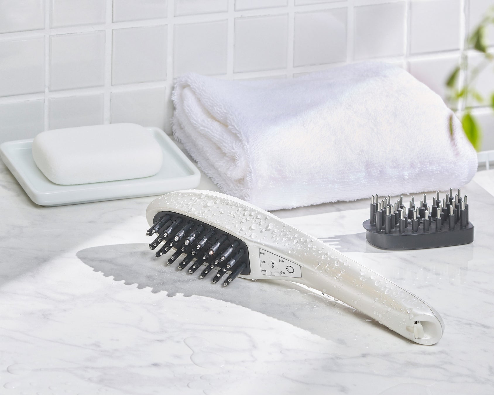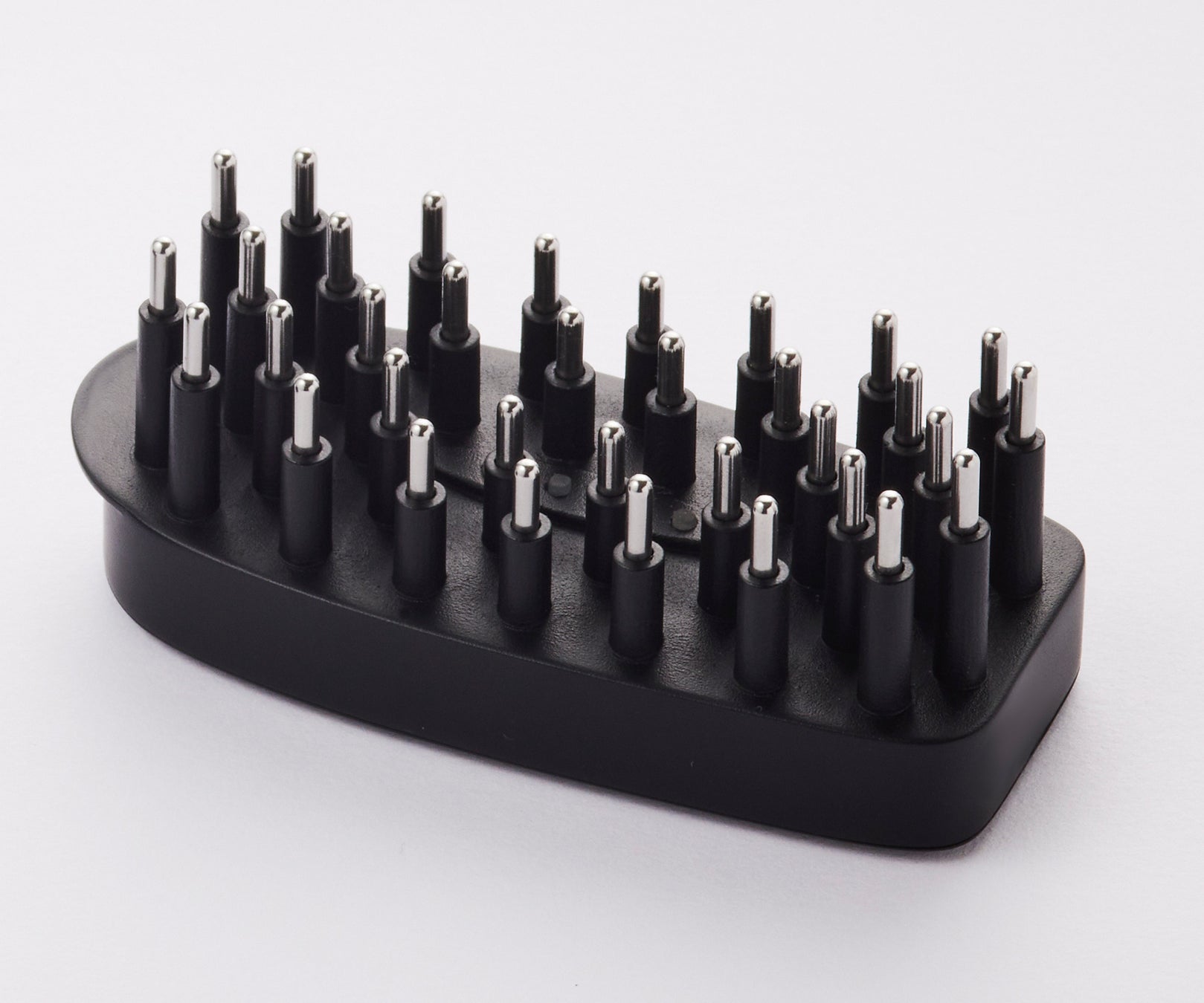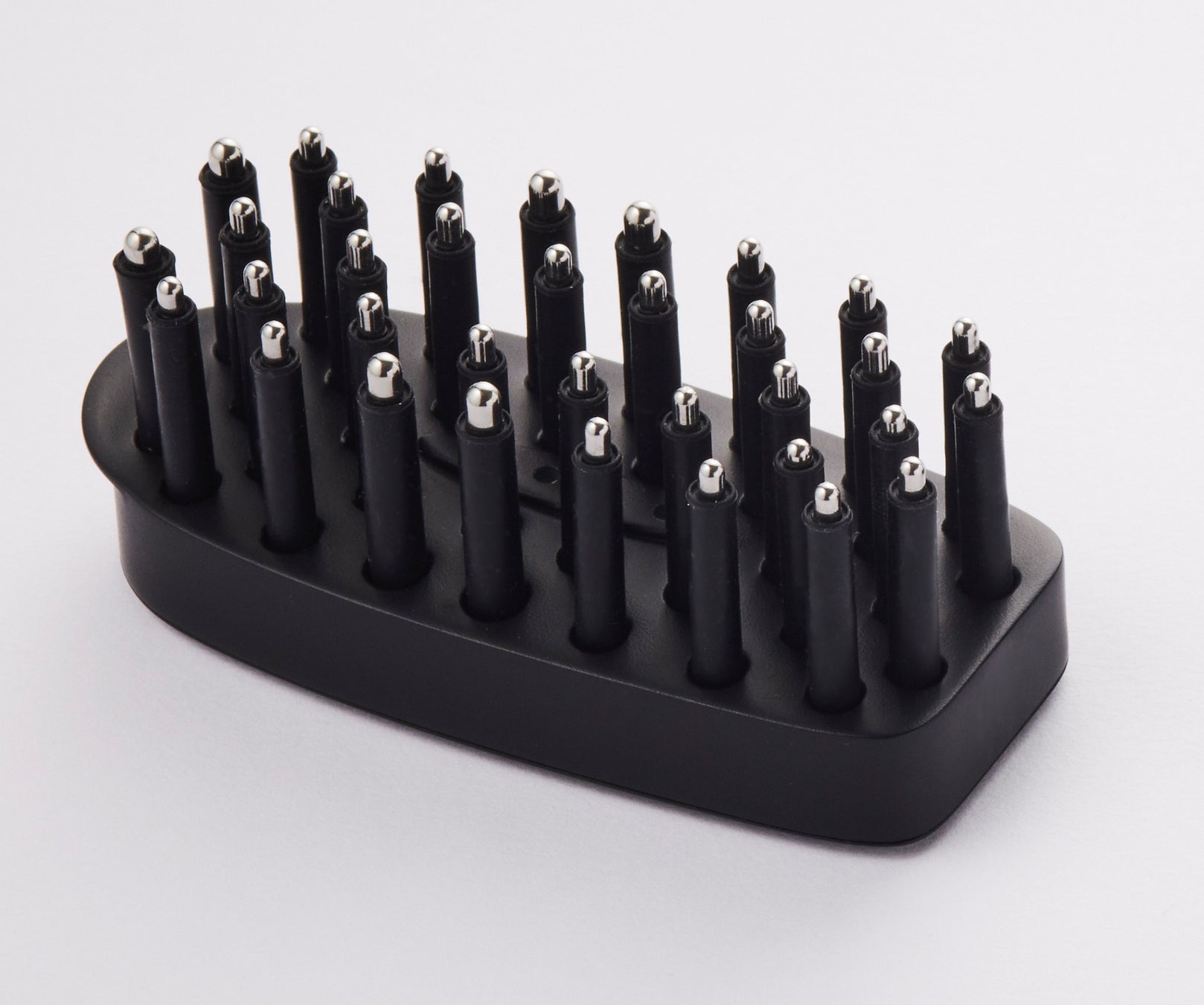 硬めのピンが髪の毛をしっかりかき分け頭皮を刺激。高さに変化を出すことで頭のカーブにフィット。