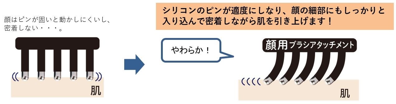 やわらかいピンが顔の凹凸部分にもフィットしやすく、しっかり密着し、デリケートな肌をやさしく刺激。