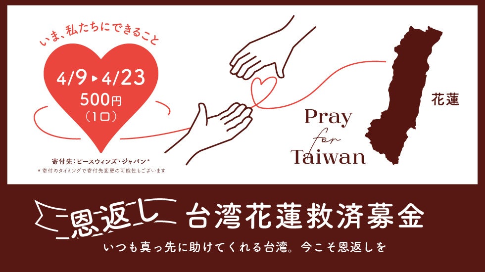 いつも真っ先に助けてくれる台湾へ恩返しをすべく、「エシカミー」では被災地を支援する募金活動を開始。皆さまからいただきました支援金と本社オフィスでの募金をピースウィンズ・ジャパン「台湾花蓮地震 緊急支援」へ寄付します。