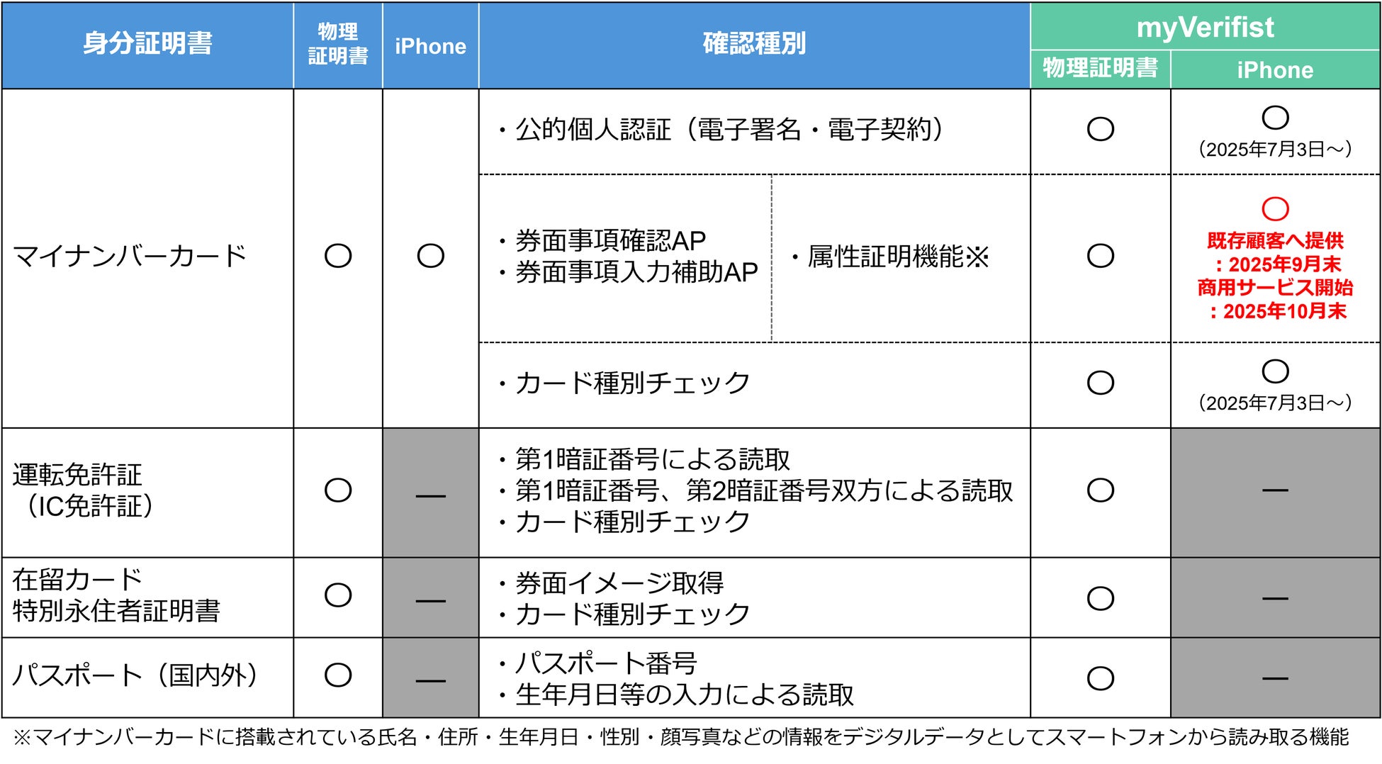 現在、myVerifistは全国のソフトバンクショップや高級宝飾店を扱う店舗で導入されています。今回の機能追加により、iPhoneを用いたマイナンバーカードの全機能読み取りが技術的に可能となり、9月末よりソフトウェアライブラリの提供を予定しています。