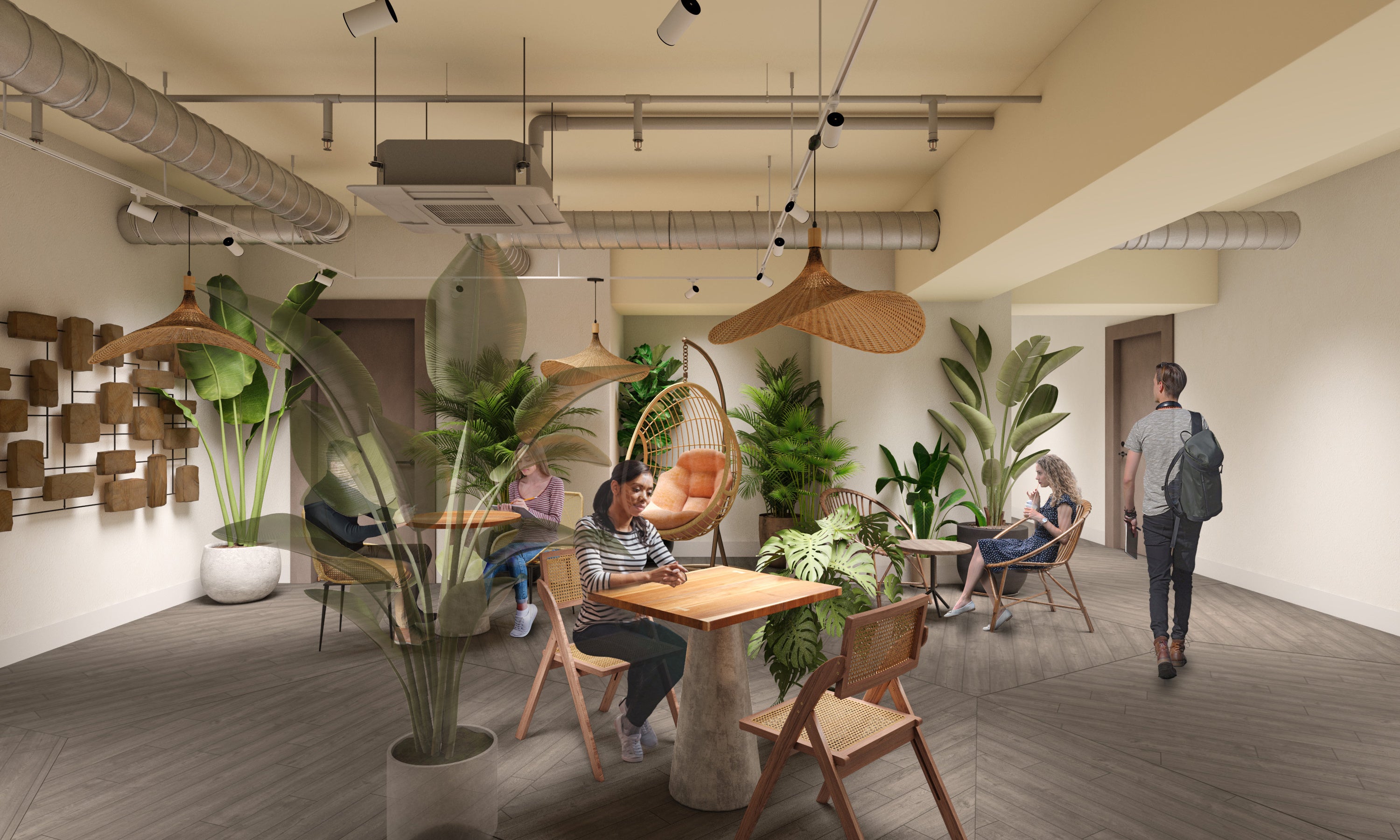 4階メインラウンジ、各階のサイドラウンジは、リゾート地をイメージしたインテリアで構成し、リラックスできる空間として、仕事の合間のブレイクタイムや打合せの際にご利用いただけます。また予約制のフォンブースを2箇所設置し、集中した業務やWEB会議などにも対応しています。