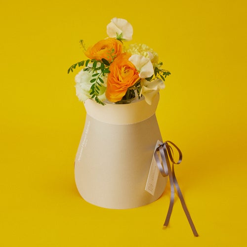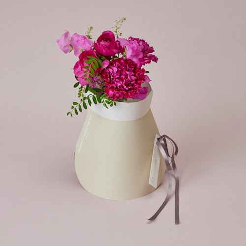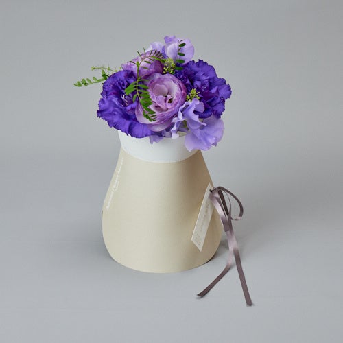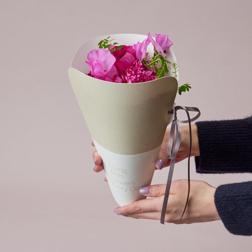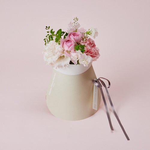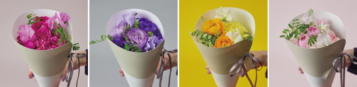 「クレープブーケ」 デザインオフィス「nendo」との共同開発でうまれたクレープブーケは、パッケージを花瓶代わりに使うことができる、嬉しい工夫がたくさんつまった進化系ブーケ。