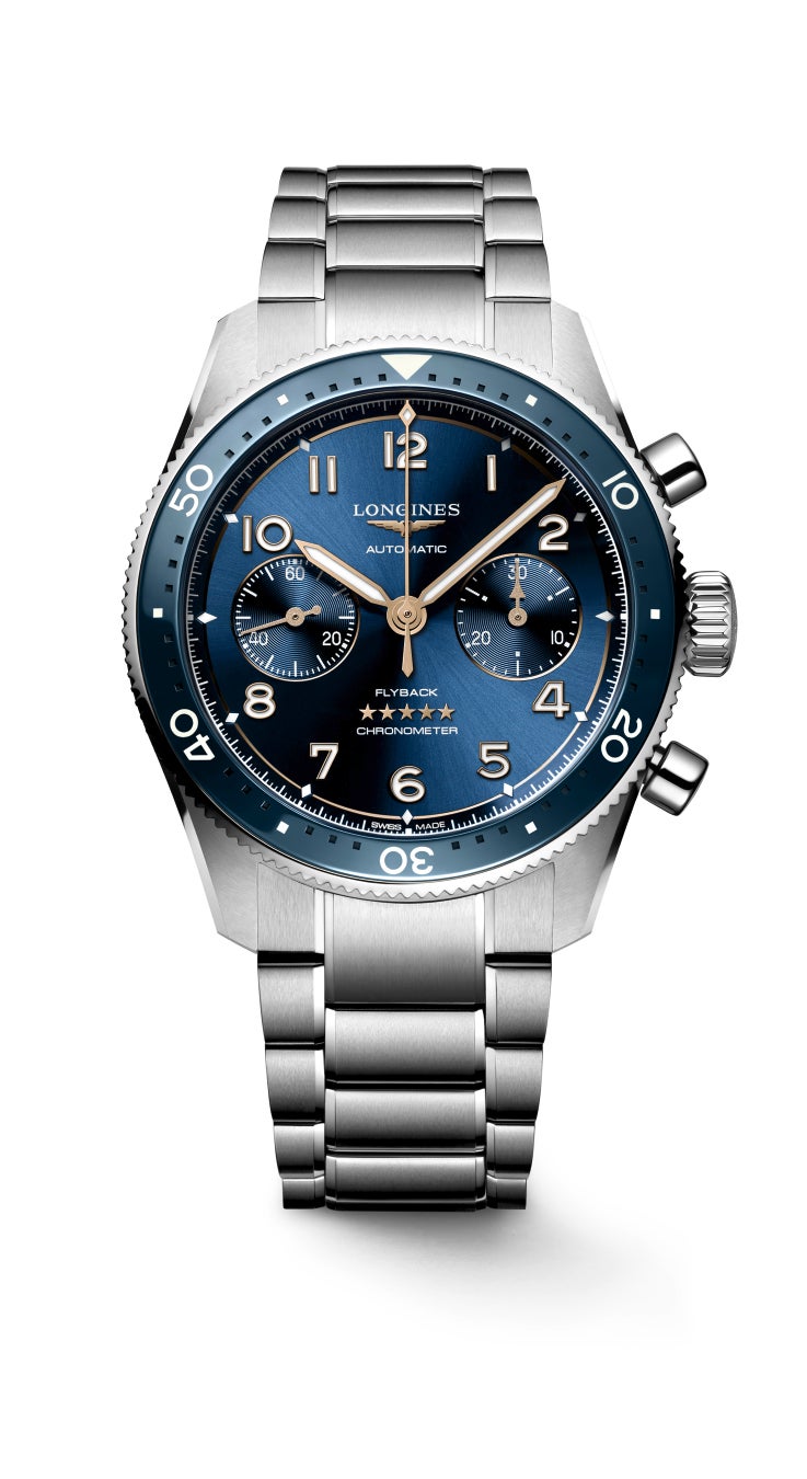 ロンジンの類まれな歴史的な遺産を軸に誕生した新作「ロンジン スピリット フライバック」は、最先端技術による高い機能性と精度を備えたタイムピースです。搭載するロンジンの新エクスクルーシブ キャリバーは、シリコン製ヒゲゼンマイで、耐磁性、約68時間のパワーリザーブ、10気圧防水、COSCのクロノメーター認証を取得。42mmのステンレススティールケースで、双方向回転ベゼルはカラーセラミック製インサートと夜光塗料を施したマーカー付き。「ロンジン スピリット」コレクション初となるシースルーケースバック採用で、ローターにコレクションを象徴する地球儀と「ロンジン フライバック」の文字を刻印しました。ダイアルはブラックまたはブルーのサンレイで、スーパールミノバ®を施したブロンズカラーの針と数字は優れた視認性を発揮します。洗練された美しさと、サテン、マット、ポリッシュ、エングレービングなどの細部にまでこだわった仕上げも特徴。ストラップには、インターチェンジャブルシステムのステンレススティールブレスレット、ブラウンレザー、ブルーファブリックのストラップをラインナップし、新しいマイクロアジャストメントシステム搭載のフォールディング・クラスプが最高の快適さと完璧なフィット感を実現します。