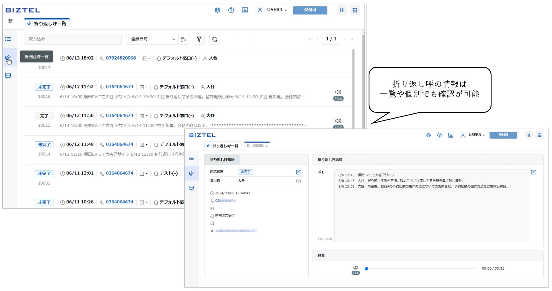 お客さまへの折り返しが必要な通話を「折り返し呼」として登録し、管理ができる機能です。