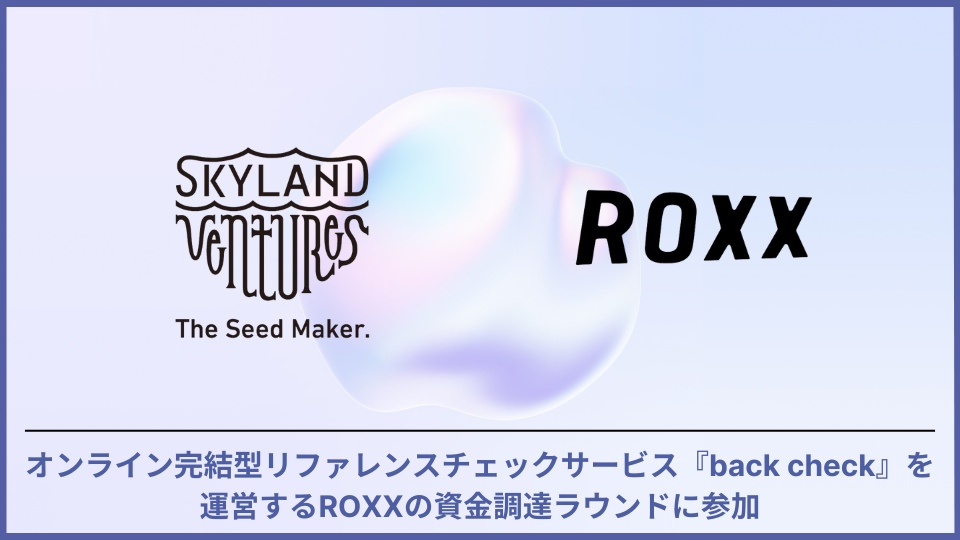 シードスタートアップ投資をメインに行うベンチャーキャピタルファンド、Skyland Ventures (本社:東京都渋谷区、パートナー・CEO:木下慶彦、以下SV) は、オンライン完結型リファレンスチェックサービス『back check』および、人材紹介会社の経営支援プラットフォーム『agent bank』を運営する株式会社ROXX(所在地:東京都新宿区、代表取締役:中嶋 汰朗、以下、ROXX)の資金調達ラウンドに参加し、追加投資を実施したことをお知らせします。今回の資金調達ラウンドではSVの他、SMBCベンチャーキャピタルが参加しています。