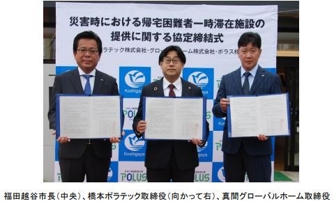 ポラスグループのポラテック株式会社、グローバルホーム株式会社、ポラス株式会社は、越谷市と令和4年(20 22年)10月16日(日)にポラスグループの施設『体感すまいパーク越谷』において「災害時における帰宅困難者一時滞在施設の提供に関する協定」を締結しました。