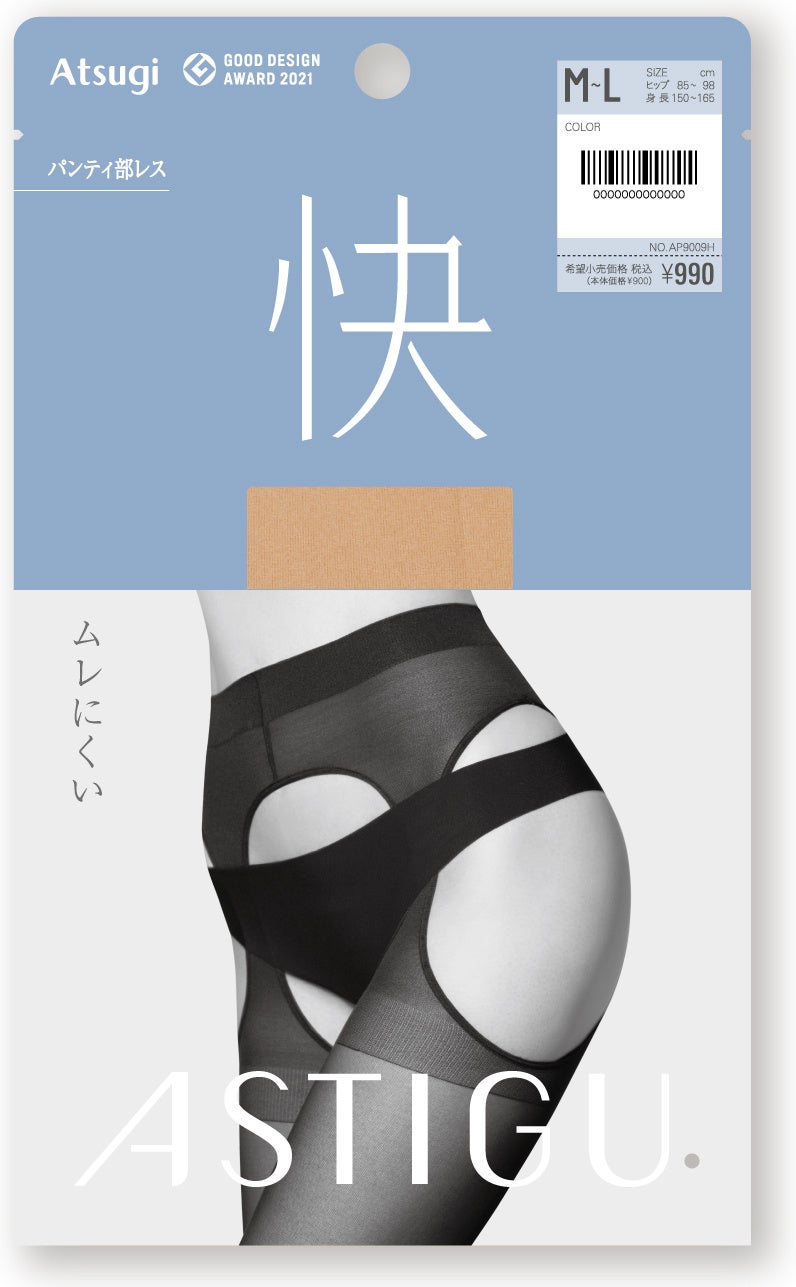 着用後にショーツをはくと、お手洗いの時やサニタリー期もショーツのみの着脱で済むため、面倒なレッグウェアの上げ下げが不要に。時短&上げ下げで伝線させてしまうリスクを軽減します。レッグウェア着用時のちょっとしたわずらわしさから解放してくれる便利なアイテムとして、2022 年春夏シーズンの発売以来アスティーグ【 快】ストッキングが好評をいただいております。