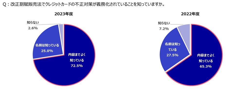 ① 割賦販売法でふれられているクレジットカードの不正利用防止措置義務化について、7割以上が内容までよく知っている。前年より7%増加しており、セキュリティ意識が高まっていると言える。