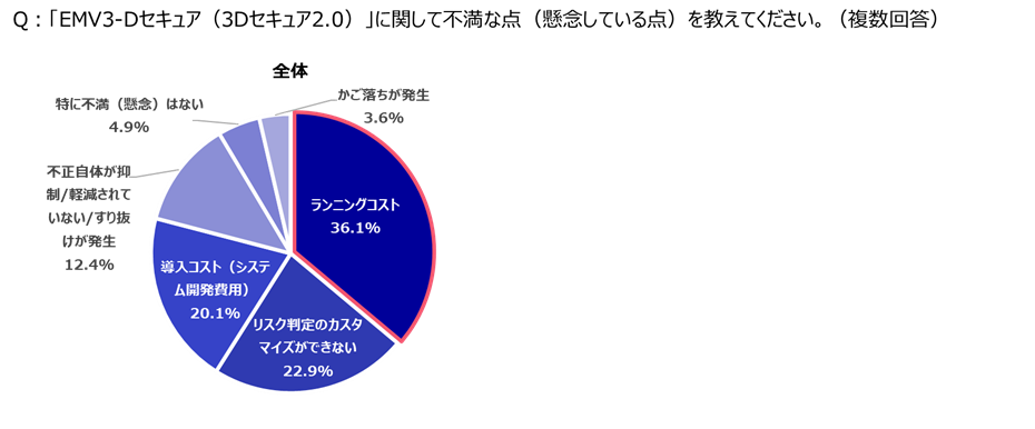 不正注文対策において本人認証の主流になっているのは3Dセキュアでしたが、その最新版であるEMV3-Dセキュアを導入している割合は36.1%にとどまっています。導入が進まない課題として最も多くあがったのはコストの問題で、次に商品単価や商材などを加味した判定ロジックのカスタマイズができない点、不正者のすり抜けなどが危惧されています。