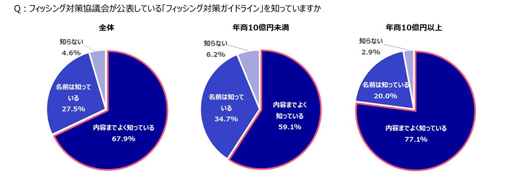 ② 「フィッシング対策ガイドライン」※3について、67%が内容までよく知っている。企業規模別にみると、年商10億円未満では59.1%にとどまり、10億円以上では77.1%が良く知っていると回答。企業規模によって意識の違いがみられる。