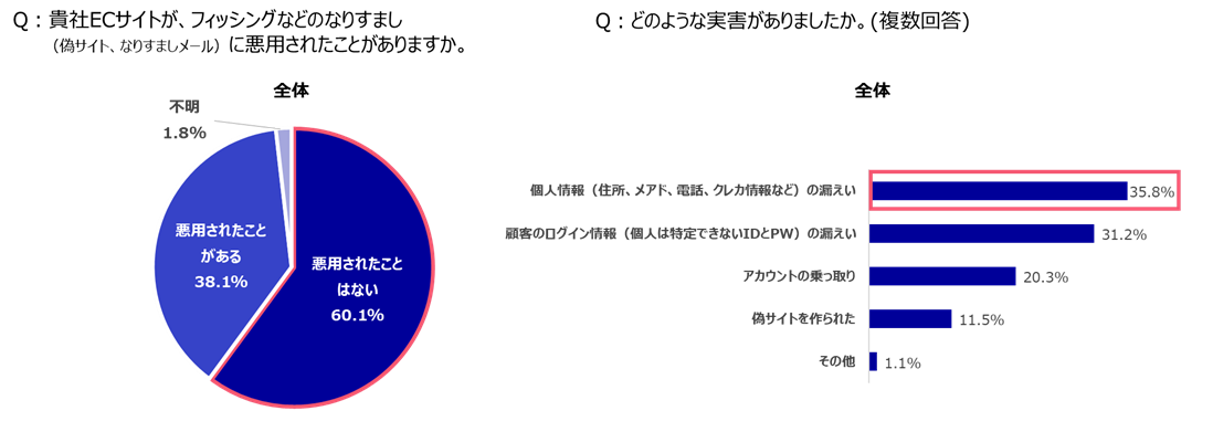 ⑥ フィッシング被害にあったことがあるEC事業者は、38.1%の約3社に1社で被害内容としては、個人情報漏洩が最も多かった。