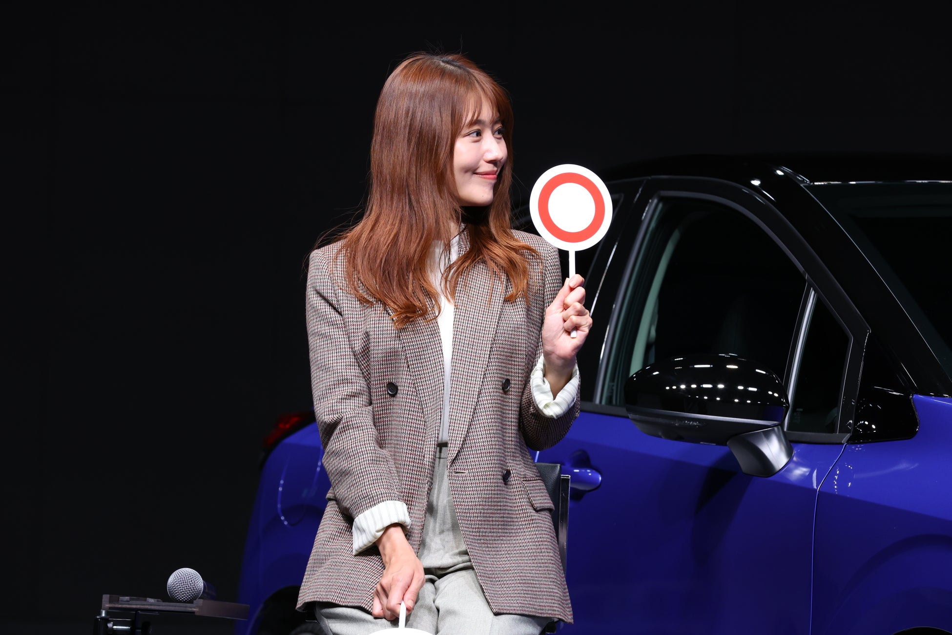 発表会の最後には、有村さんが「日産ノート e-POWERクイズ」に挑戦。「日産ノート e-POWERは昨年最も売れたコンパクトカー?」という問題に対して、有村さんは〇と回答し見事正解。「ノートと兄弟車のノートオーラの合計台数が、2023年のコンパクトカー販売台数でNo. 1を獲得*1しました。」という解説に対して「これはもう、間違いない!」とコメント。また「日産ノート e-POWERはアクセルだけで加減速ができる?」という問題にも〇と回答し見事正解。「アクセルを踏むと、スーッとスタート・加速して、離すとゆっくりスローダウンしてくれる。操作が簡単で安心して乗れました。」と試乗の感想も交えて回答いただくなど、e-POWERクイズをとても楽しまれていました。