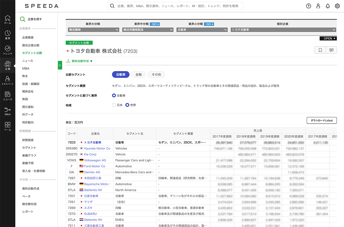 SPEEDA、「新・セグメント比較機能」にグローバル企業データを拡充