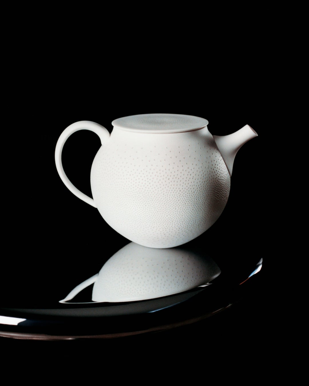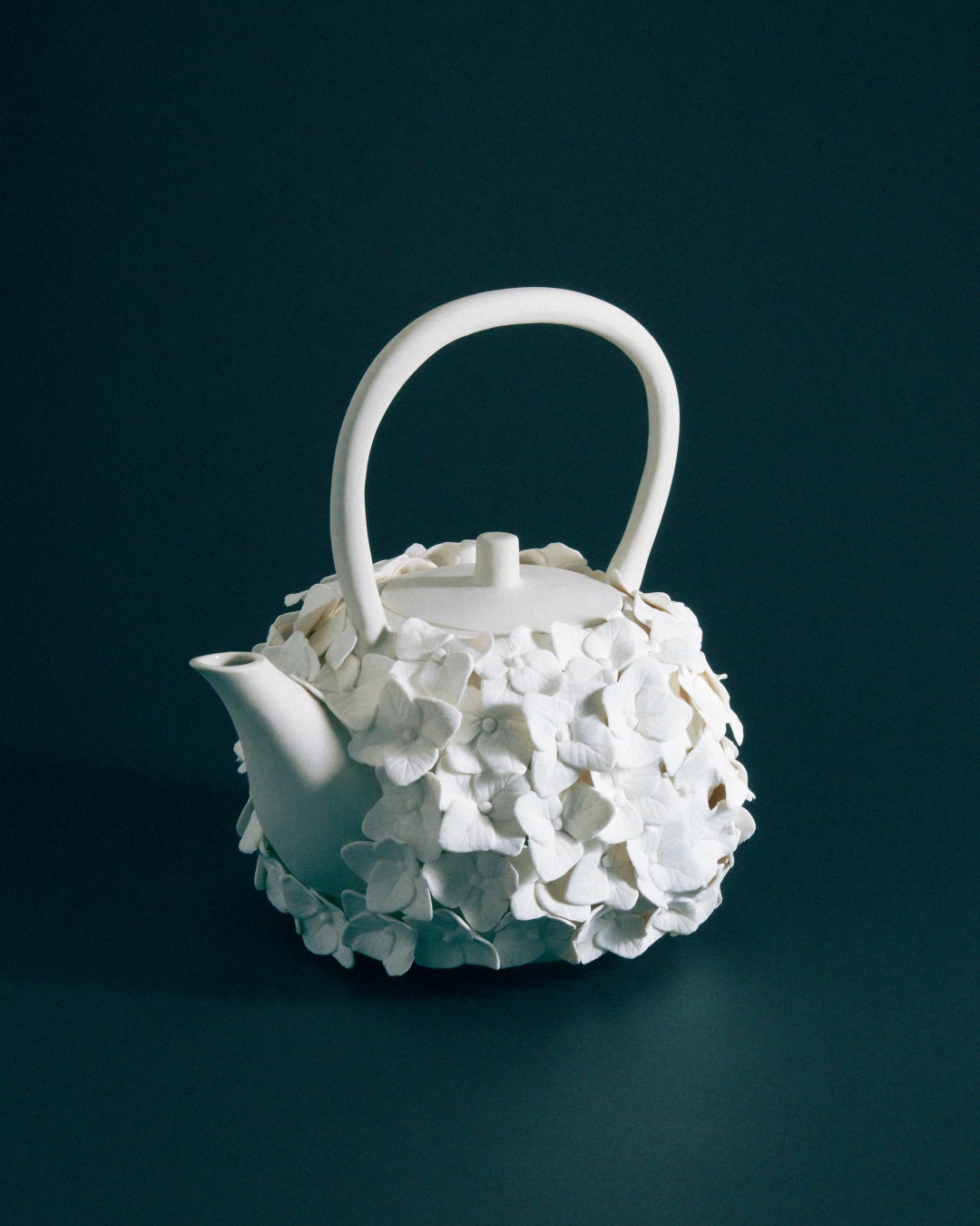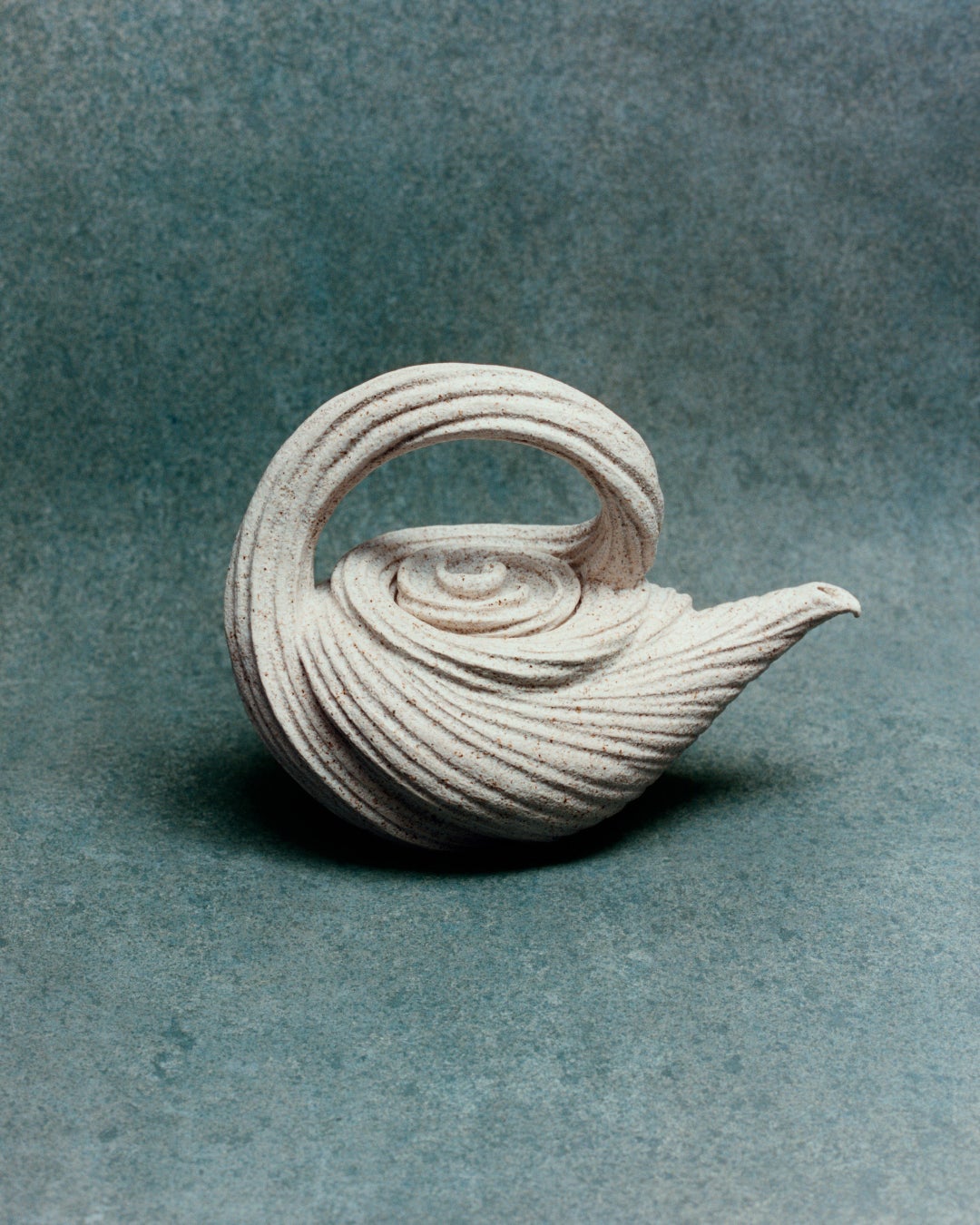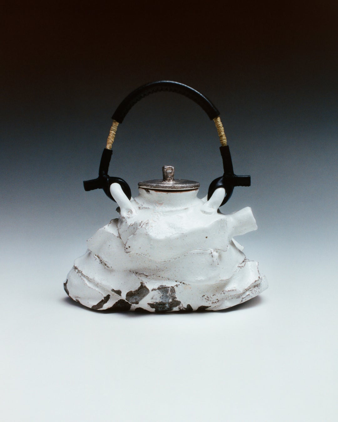 イギリスのロイヤル・アルバートの陶磁器ティーセットに着想を得たローズ・ワイリーのティーポットには、誇張された蓋と波型の細部装飾が見られる一方、ジェーン・ヤン-デーンの細長いポットは擦り切れた粘土のリボンに包まれています。光を通す浅い穴が表面を覆う新里明士のポットに、表面全体を畝が走り一塊の粘土から巻き上がる渦のように見える崎山隆之のポット。シモーヌ・ファタルと道川省三のポットには上部にレザーを編み上げたハンドルが取りつけられており、デイヴィッド・チッパーフィールドによるコバルトブルーの釉薬を施したポットには銅製のハンドルがついています。道川氏のポットは水平に広がるのに対し、デン・シーピンのポットは垂直方向に伸び、ハンドルと注ぎ口が対角線上に配置されています。ルー・ビーンとマドダ・ファーニのティーポットはともに釉薬をかけない素焼き仕上げ。深い赤とお茶の風味が染み込む多孔質な土の質感が特徴です。