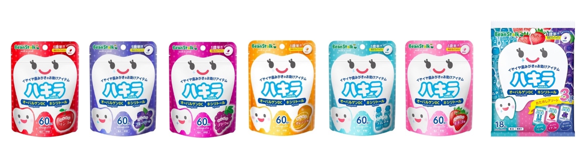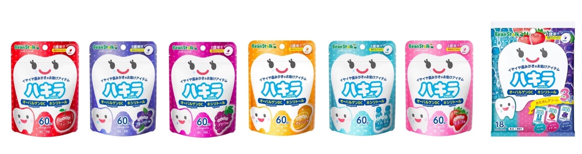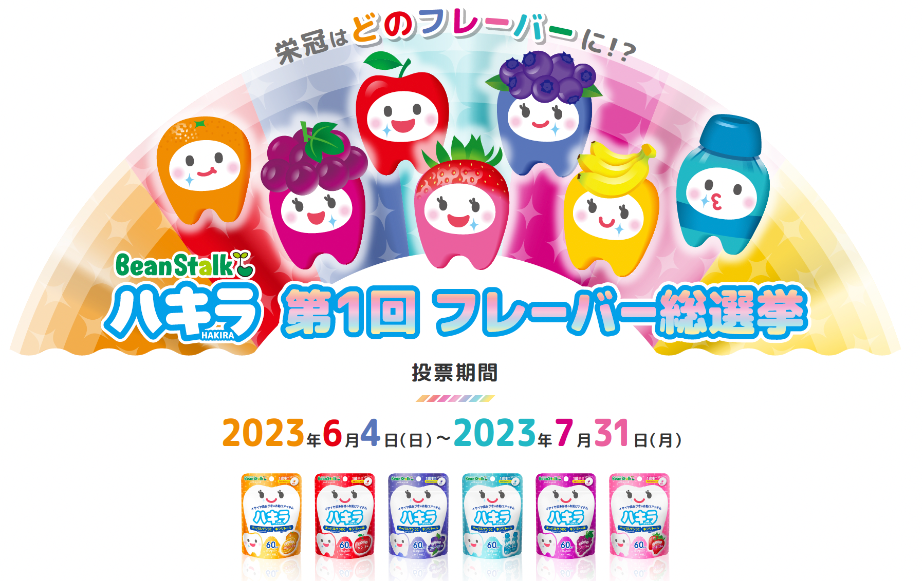 2005年にオーバルゲンDC配合の口中清涼食品として発売を開始したハキラ。「第1回ハキラフレーバー総選挙」では、現在ハキラをお使いのお子さまやそのご家族はもちろん、小さい頃ハキラをご愛用いただいていたハキラ卒業生とそのご家族のみなさまに、推しのハキラフレーバーをお選びいただきます。今回立候補するのは7つのフレーバー。現在販売しているリンゴ、ブルーベリー、ブドウ、オレンジ、ラムネ、イチゴのほか、2020年まで販売していたバナナも登場します。投票結果は、後日「まめコミ」サイト内、及び、ビーンスタークの公式Instagram(beanstalk_official)で発表します。