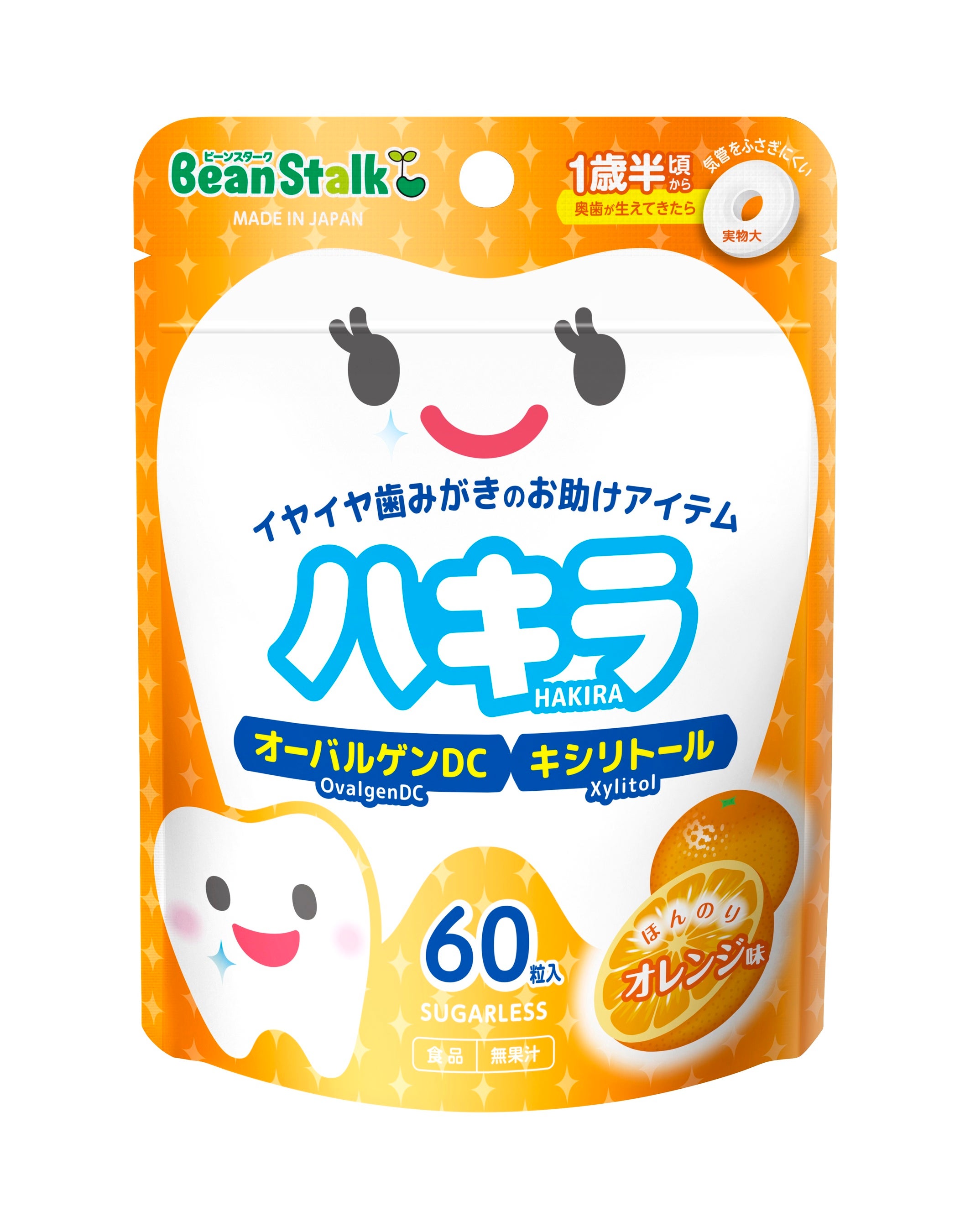 「ハキラ」は、ミュータンスコントロール オーバルゲンDCとキシリトールを配合。奥歯が生えてくる1 歳半頃からのお子さまも安心して食べられる形状のタブレットです。ほんのり味のシュガーレスタイプなので、おやつ代わりのほか、食後や歯みがきあとに。お子さまだけでなく、ママやパパもおいしく食べられます。