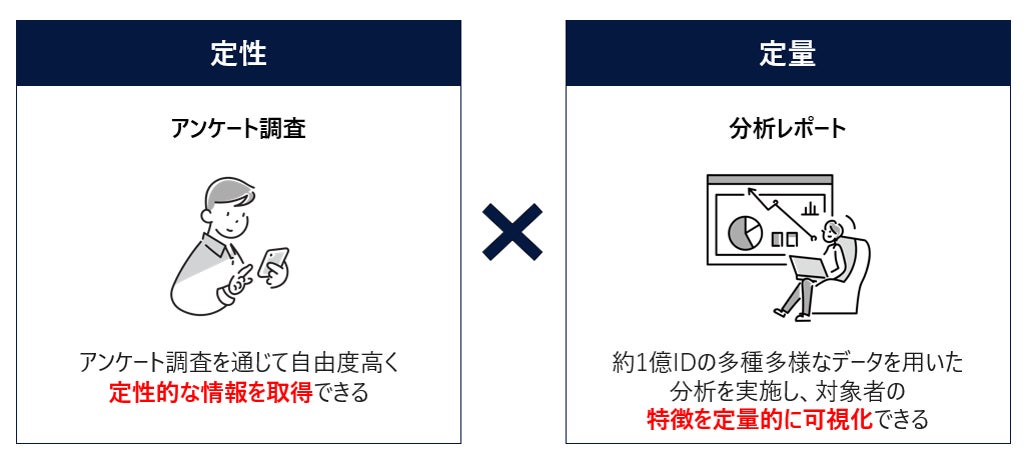 本サービスではアンケートと分析を軸に、「定性」+「定量」双方からのアプローチにより顧客の解像度を向上。ユーザーの「インサイト」と「特徴(デモグラ、興味関心、価値観等)」を明らかにします。また、そこで得たターゲット像を活かし、その後の広告施策における高精度なプランニングと効果最大化を実現します。