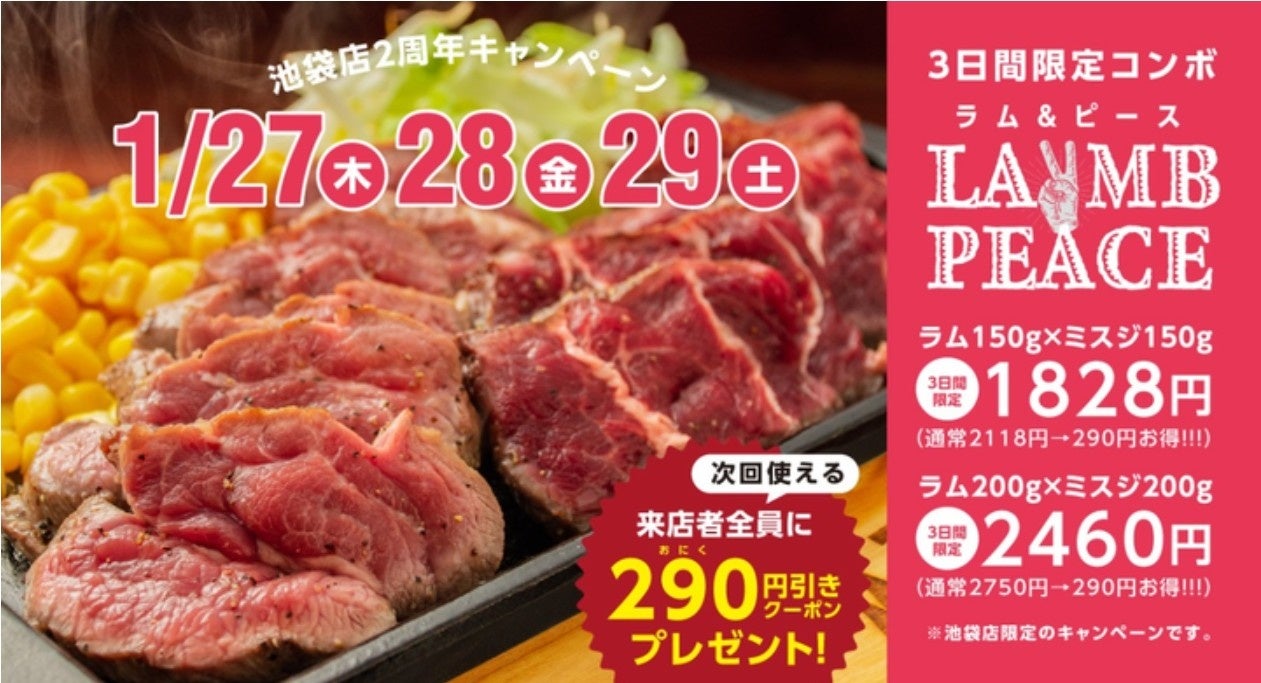 『ステーキロッヂ 池袋店』で 1/27(木)〜29(土)2周年キャンペーンを実施。3日間の限定コンボ「ラム&ビーフ」を特別価格でご提供。来店者全員特典もご用意!