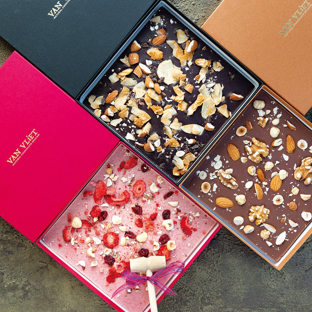 ドライフルーツやナッツを散りばめたチョコレートを付属の小さなハンマーで割りながら楽しく召し上がれ。