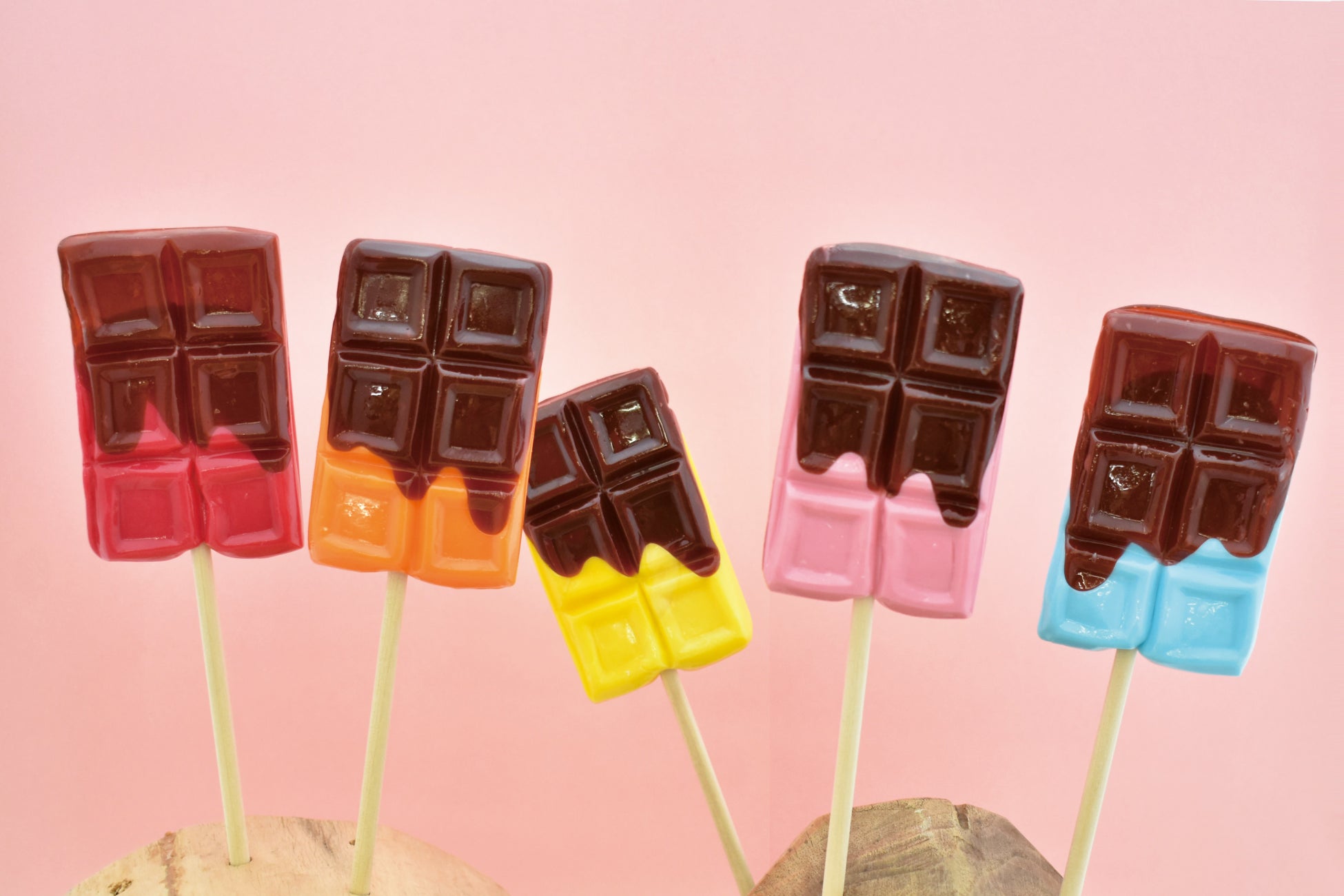 カラフルなフルーツキャンディとココアキャンディを合わせた、板チョコモチーフのスティックキャンディ。