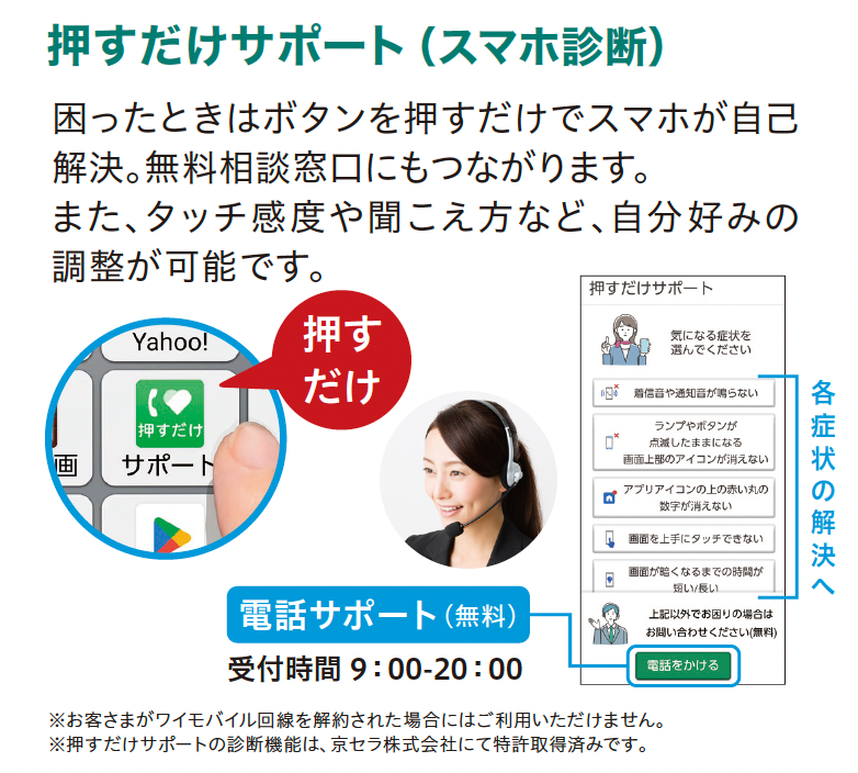 操作で困った場合に、ホーム画面にあるサポートボタンを押すだけで内容を診断して解決する機能「押すだけサポート」を搭載。解決しない場合は、専用のカスタマーセンターに電話で問い合わせて、専任のオペレーターに無料で相談が可能です※3。