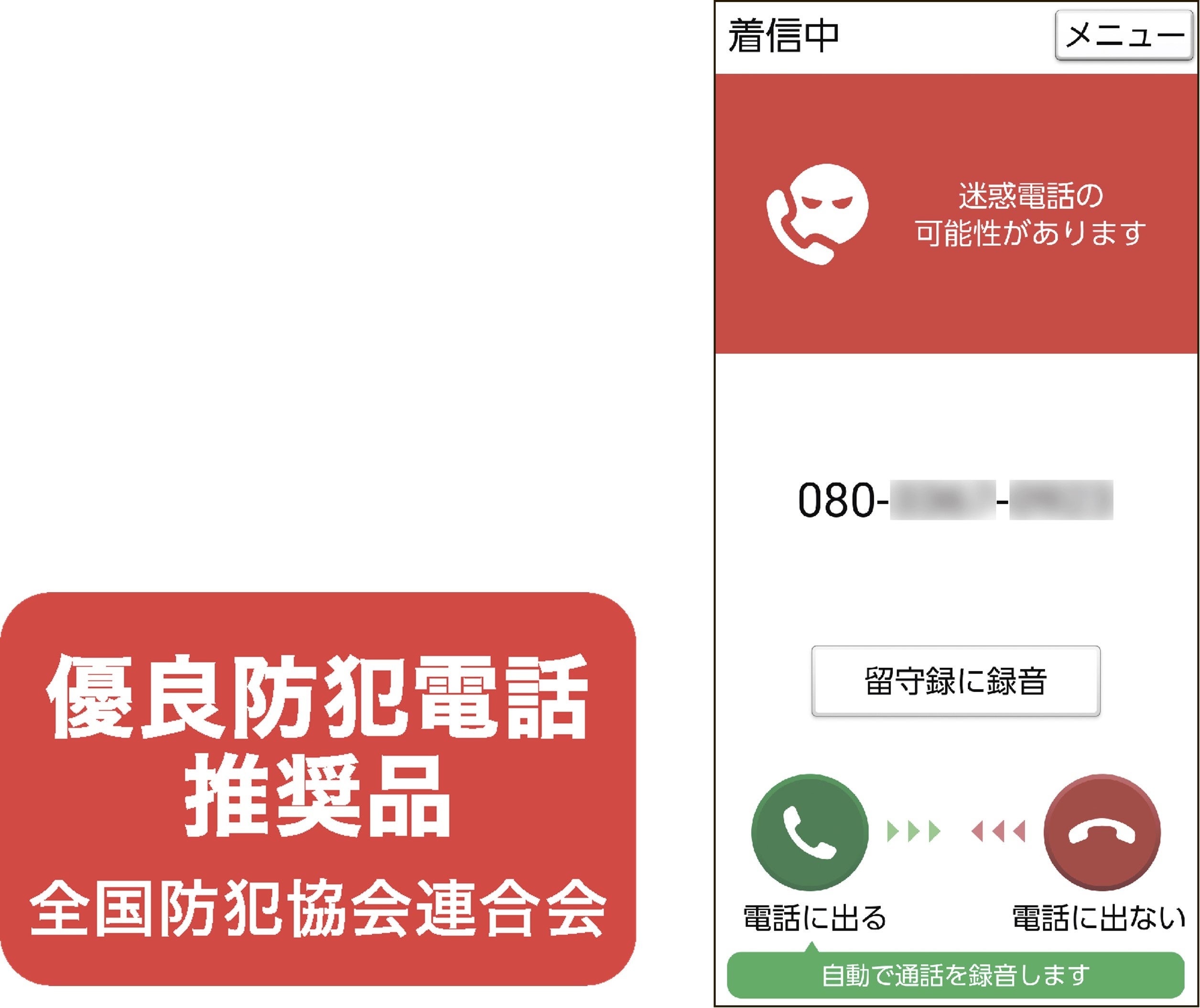 国内外の不審な電話番号を自動で判別し、警告表示でお知らせ。誤って電話に出たときは自動録音を行います。