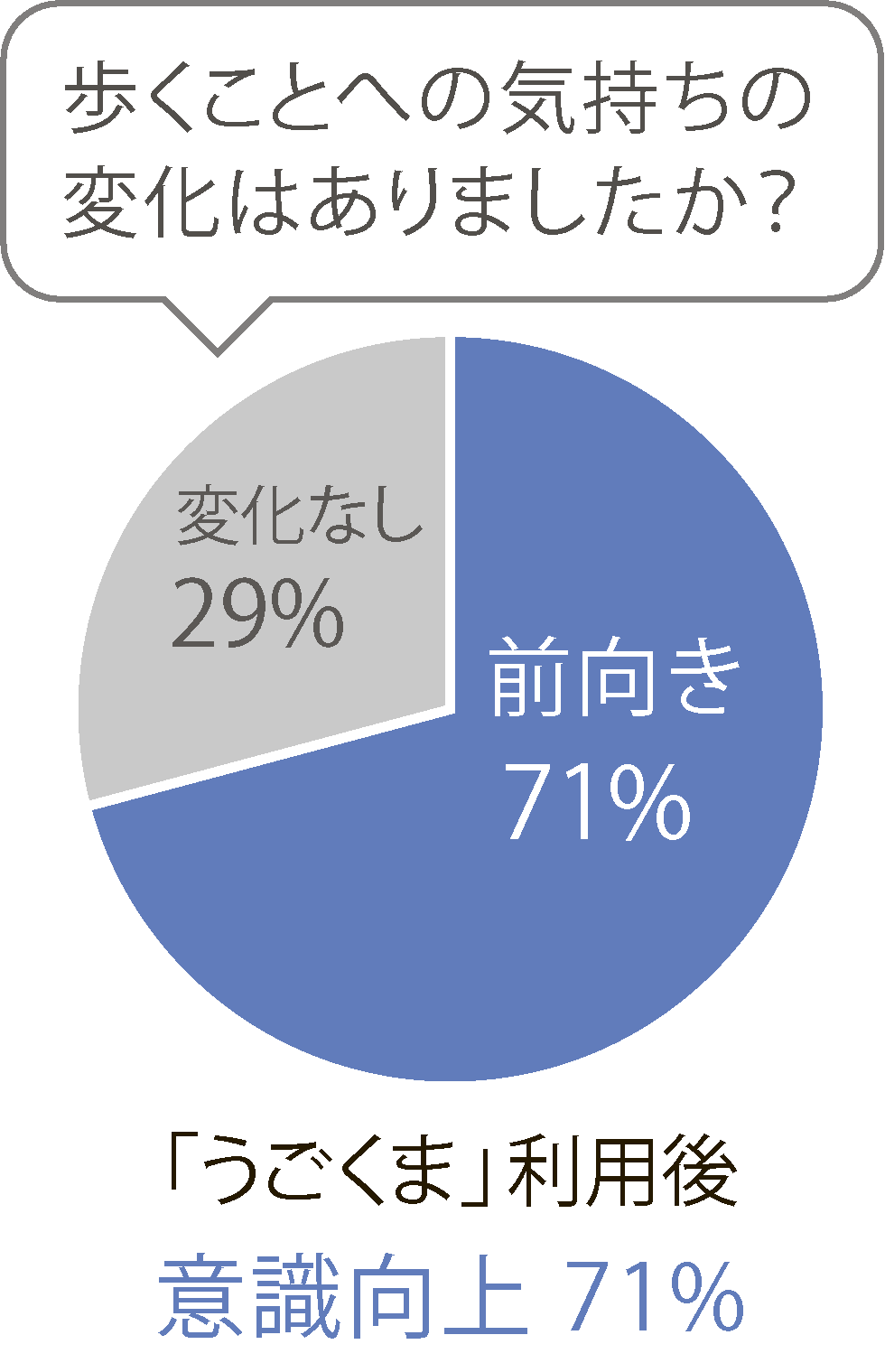 「うごくま」を使用していただいた方に 向けて アンケートを実施したところ、回答者全体の 71%が、ウォーキングに対しての意識が向上したとのお声をいただきました。