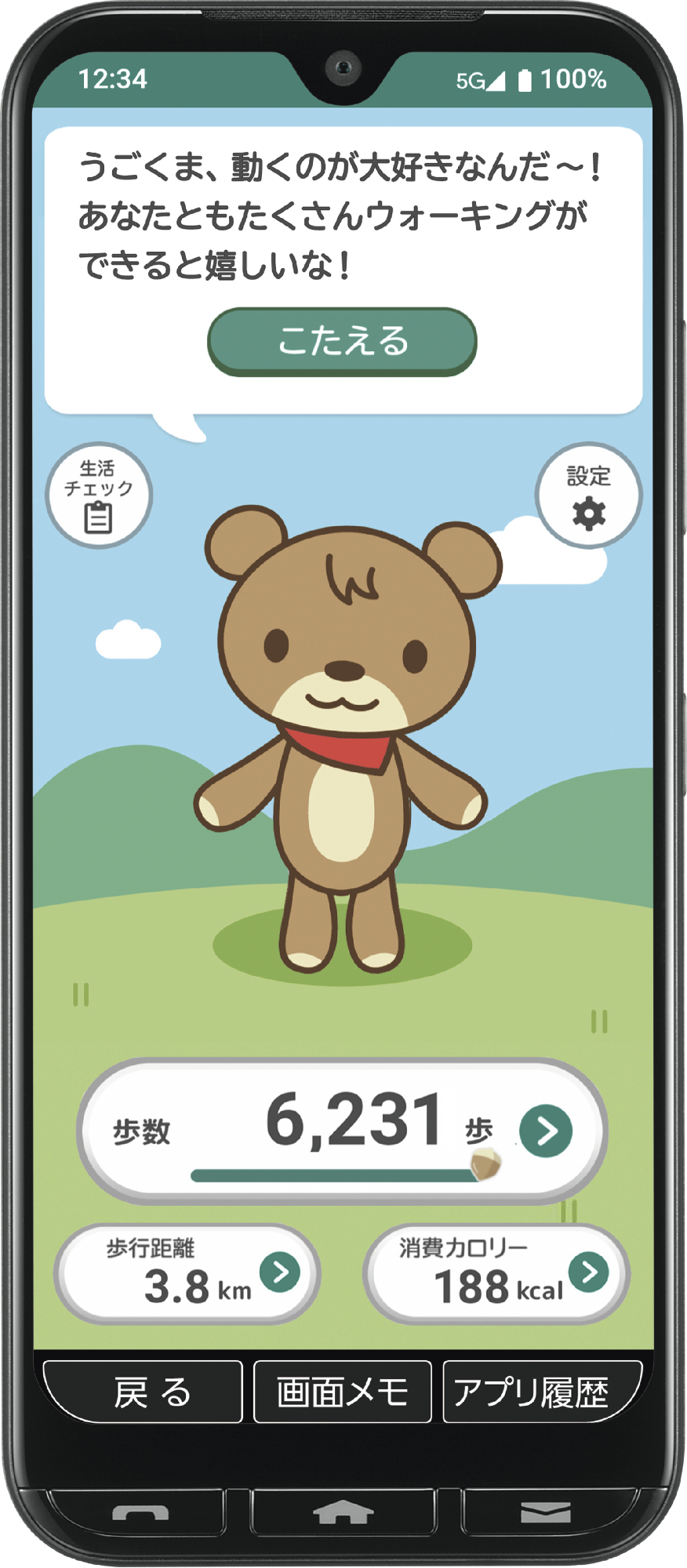 「うごくま」は、キャラクターが利用者を褒めたり励ましたり、相互にコミュニケーションを取ることで、フレイル対策に重要なウォーキングの習慣化につながる励みを醸成するアプリです。歩数や歩行距離、消費カロリー計測などが大きく分かりやすい表示で簡単に確認できる他、自身の生活を振り返りフレイルのリスクを判定できる「生活チェック機能」で、生活の改善につながるヒントを確認して日常生活に生かすことが可能です。