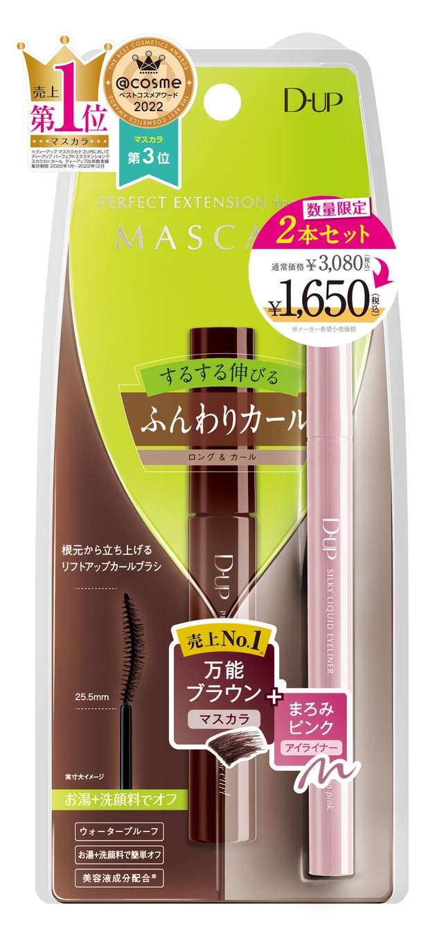 株式会社ディー・アップ(本社:東京都港区、代表取締役:坂井満)が展開する「ディーアップ マスカラ&アイライナー(全28種)」シリーズは、今年累計出荷数2,000万本*を突破し、多数のベストコスメアワードを受賞しています。日頃のご愛顧に感謝を込めて、「パーフェクトエクステンションマスカラ for カール」と「シルキーリキッドアイライナー」の特別セットを2023年12月1日(金)に数量限定で発売いたします。