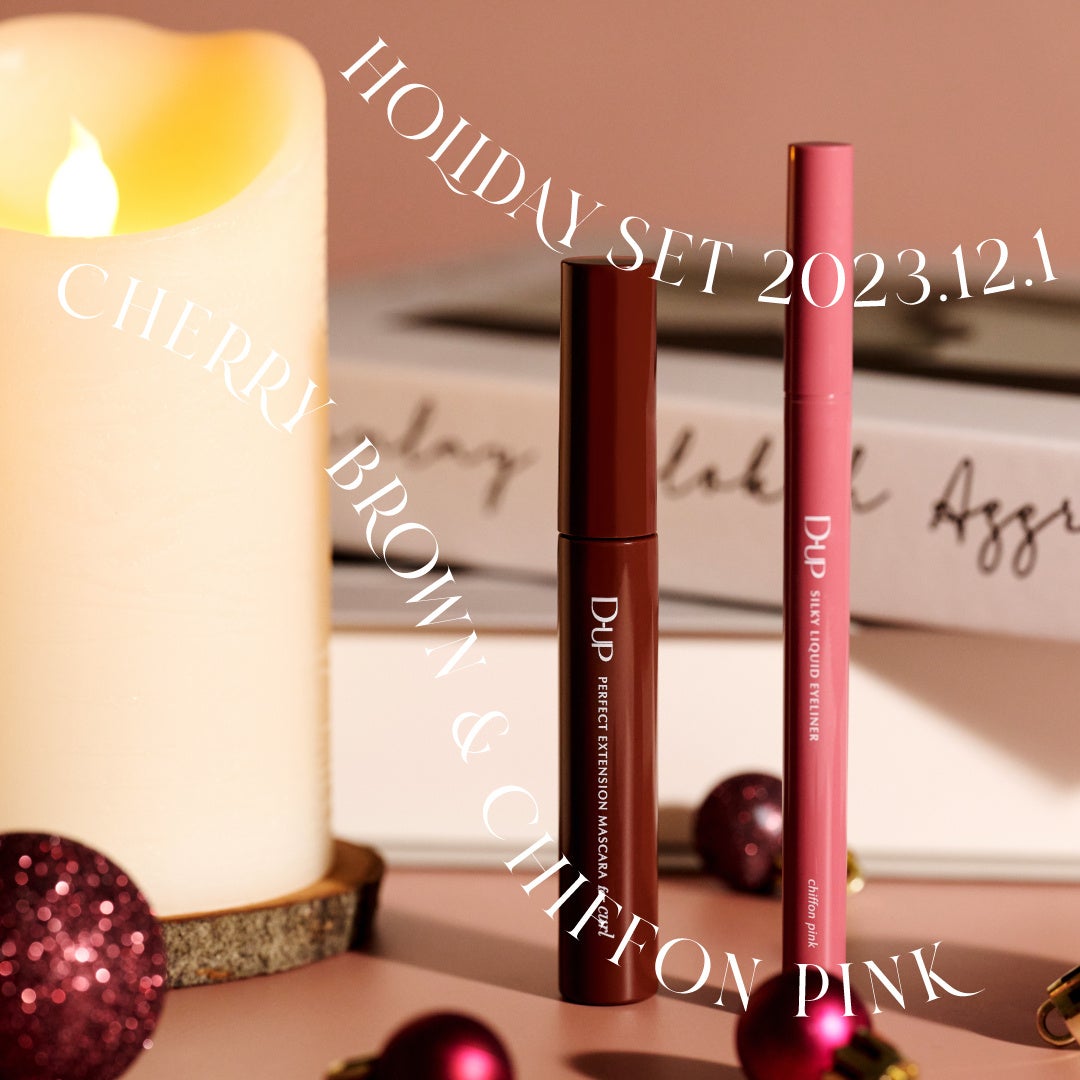 ディーアップマスカラを代表するアイテム、売上No.1**のふんわりカールマスカラ「チェリーブラウン」と、密着リキッドアイライナー「シフォンピンク」の2本が、“実質マスカラ1本分”の価格でお買い求めいただけるお得なセットです。どんなアイシャドウとも相性抜群な万能ブラウンのマスカラと、透明感を叶えるまろみピンクのアイライナーは、ホリデーシーズンにぴったりな“ほんのり甘い”目元を演出します。