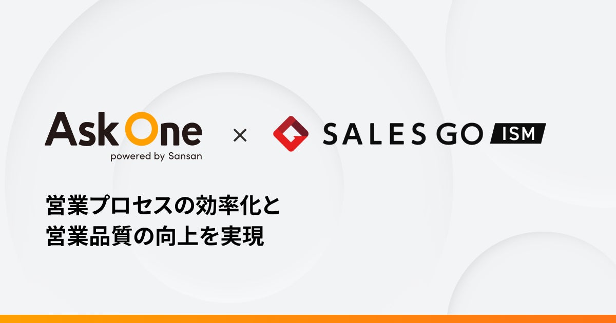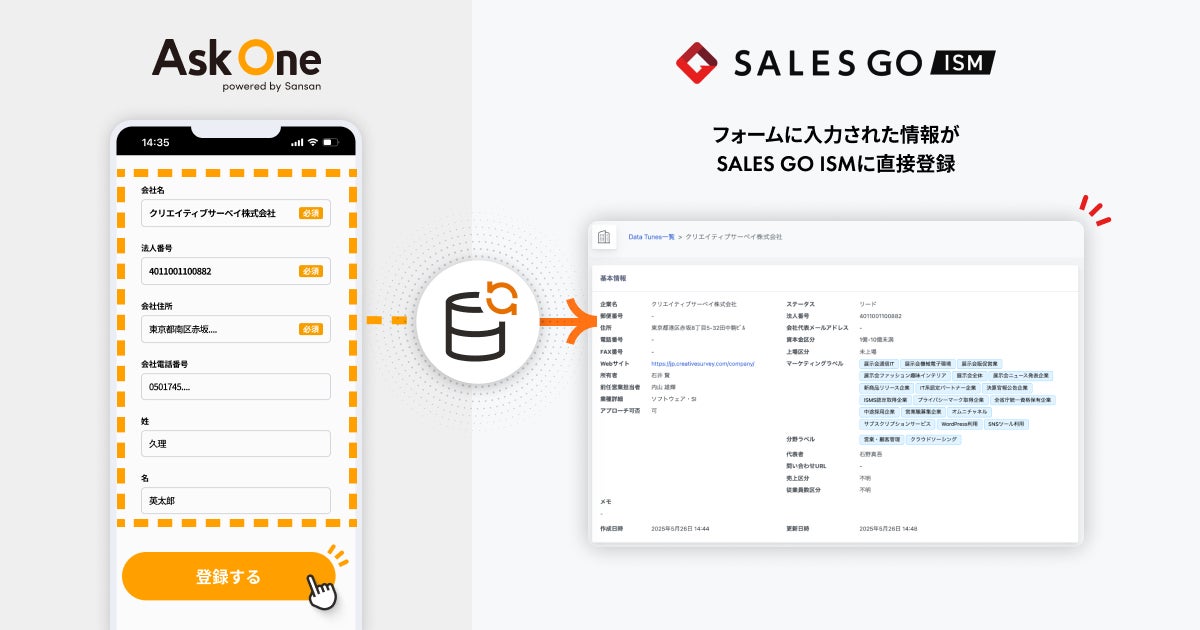 このたびのSALES GO ISMとAsk Oneの連携により、Ask Oneで作成したフォームに入力された情報をリアルタイムでSALES GO ISMに連携することが可能になります。また、連携時にはSALES GO ISMに搭載される約70万社の企業DBから、売上規模、従業員数規模、マーケティングラベルなど様々な企業情報が自動で穴埋めされます。オンライン・オフライン問わず、顧客との接点情報が手間なくSALES GO ISMに蓄積され、営業プロセスの効率化と営業品質の向上を実現します。