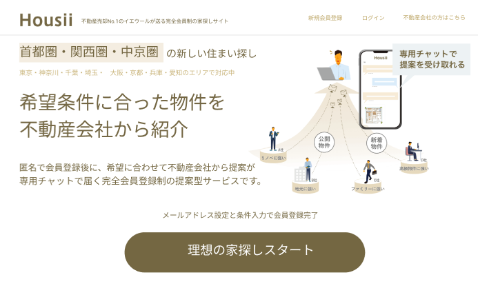Housii(https://ieul.jp/buy/)は不動産会社から直接物件情報を受け取ることができる、完全会員制の家探しサービスです。