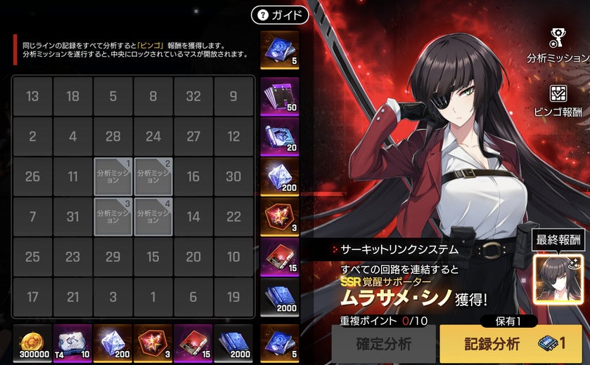 ビンゴを1列完成させるごとに、採用契約書やクオーツ、機密訓練資料などの報酬が獲得可能です。また、すべてのビンゴを完成させると、最終報酬としてSSR覚醒サポーター「ムラサメ・シノ」をプレゼントいたします。