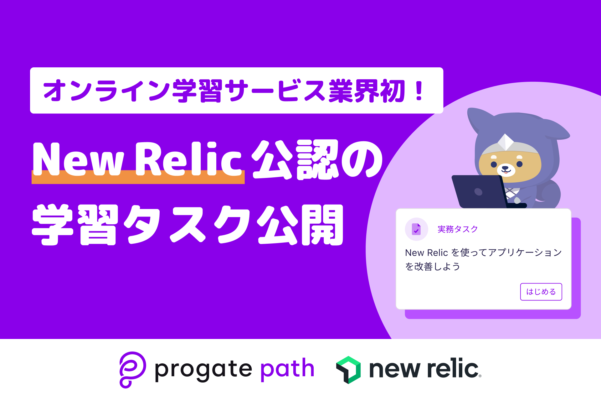 しかし、オンライン学習サービス業界にはNew Relic公認の学習教材がなく、New Relicやオブザーバビリティについて気軽に学ぶことはできませんでした。そこでProgateはNew Relic協力のもとエンジニア実務を学習できるProgate Pathにおいて、オンライン学習サービス業界初となるNew Relic公認の実務学習タスク「New Relic を使ってアプリケーションを改善しよう」を制作し、本日より提供を開始しました。